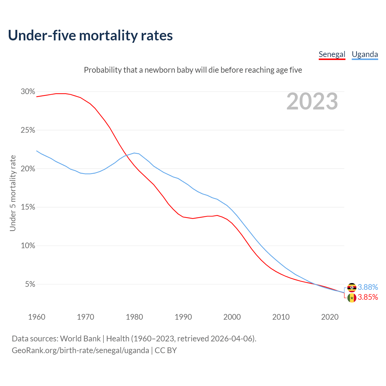 The chance that a newborn baby will die before reaching age five is 3.85% in Senegal and 3.88% in Uganda. Above is a chart with historical data on under-five mortality rates.