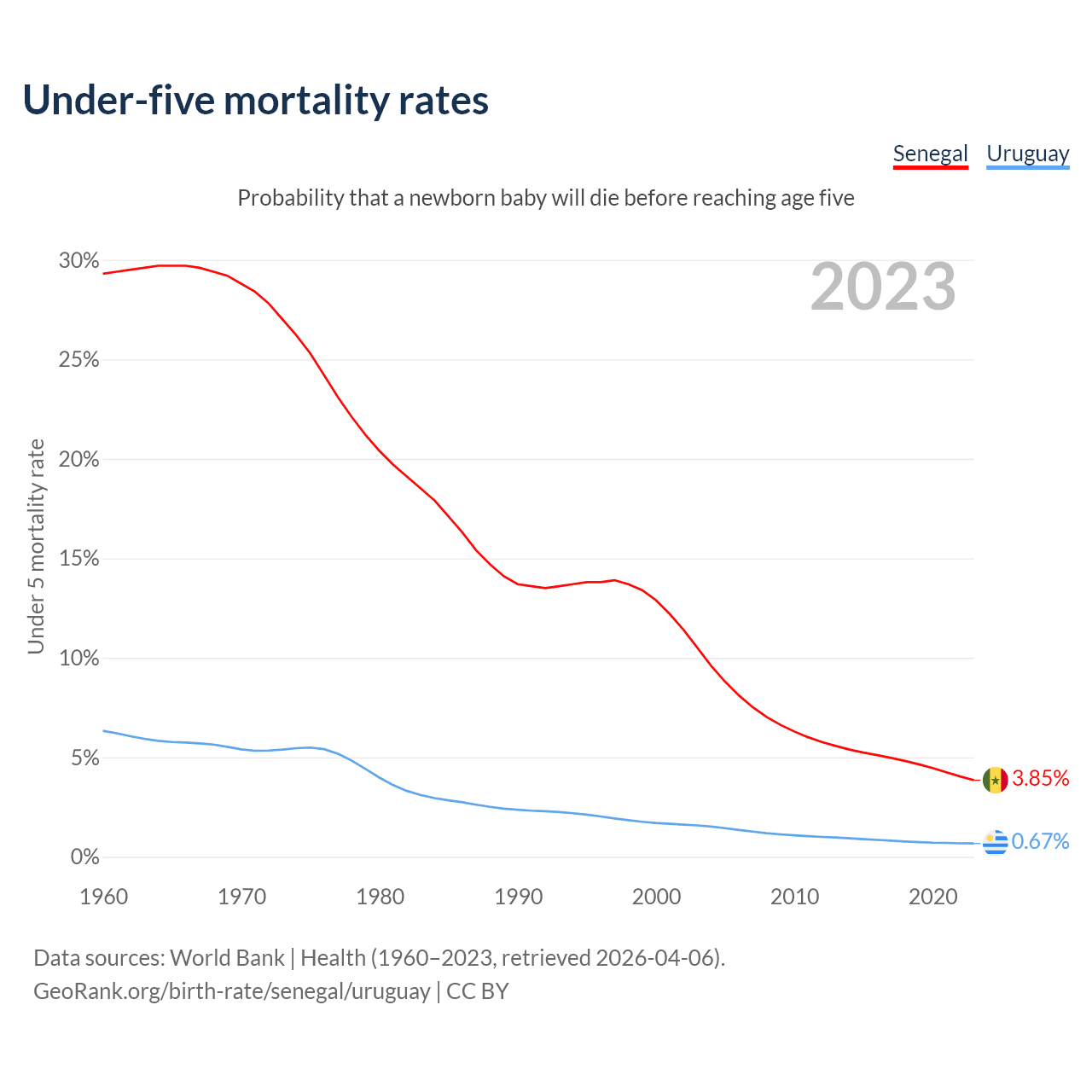 The chance that a newborn baby will die before reaching age five is 3.85% in Senegal and 0.67% in Uruguay. Above is a chart with historical data on under-five mortality rates.