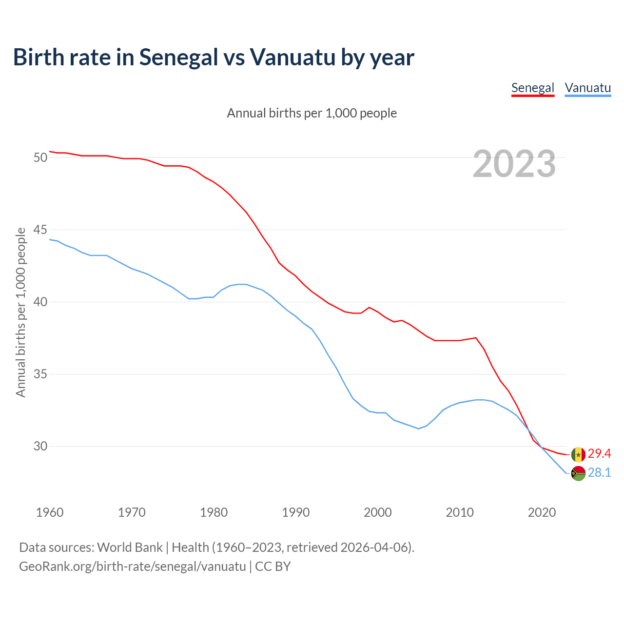 Senegal has an annual birth rate of 29.4 births per 1,000 people, compared to 28.1 for Vanuatu. The average number of children a woman is expected to have during her lifetime — the fertility rate, is 3.82 in Senegal and 3.6 in Vanuatu — 5.81% difference.