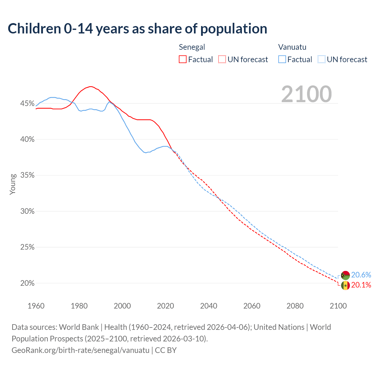 According to the latest available data on birth rates, the fertility rate in Senegal was 3.82 children per woman in 2023, compared to 3.6 in Vanuatu in 2023. The replacement level is considered to be 2.1 children per woman.