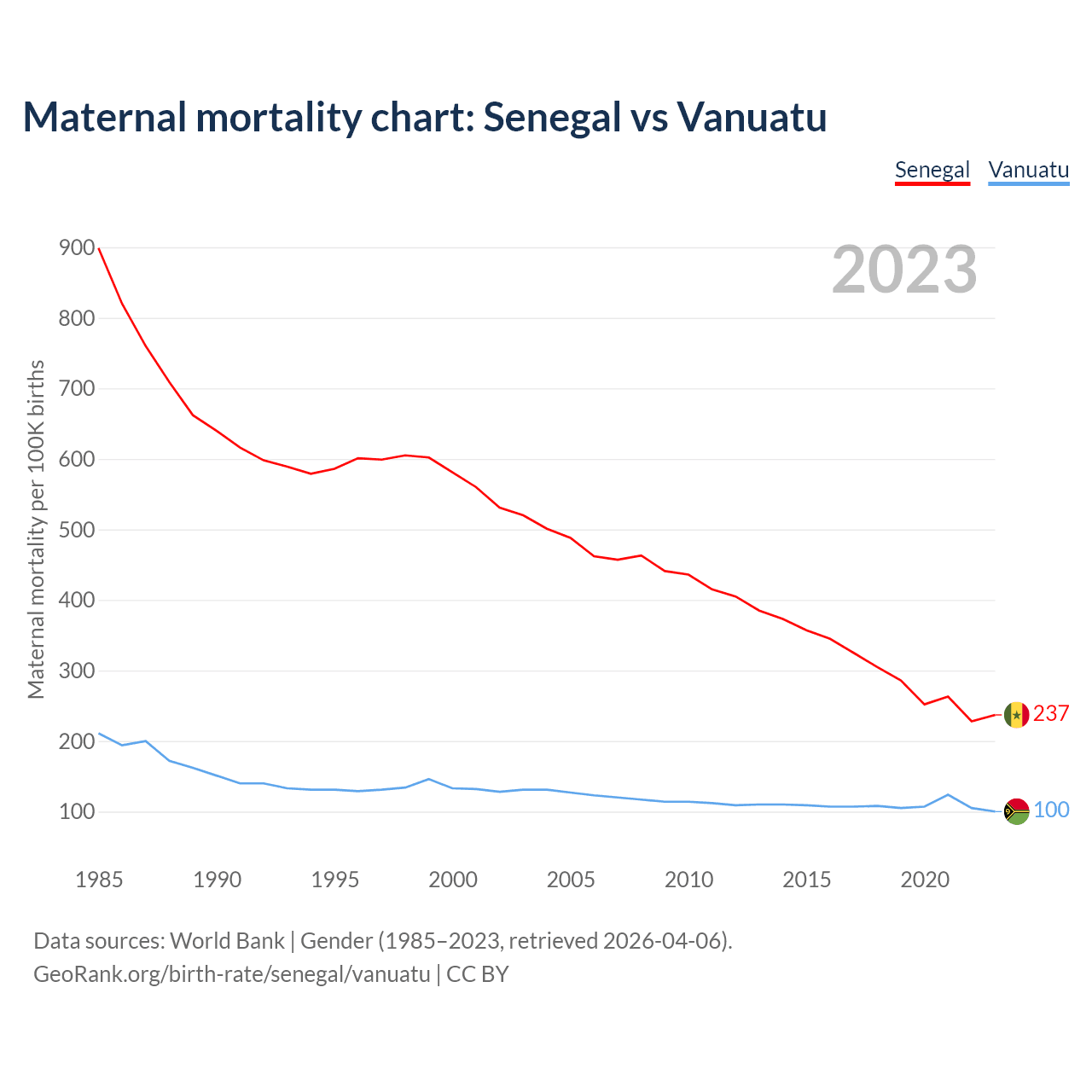 The maternal mortality rate, which is the probability of dying during childbirth or within 42 days of pregnancy termination, is 237 deaths per 100,000 live births in Senegal, compared to 100 deaths in Vanuatu.