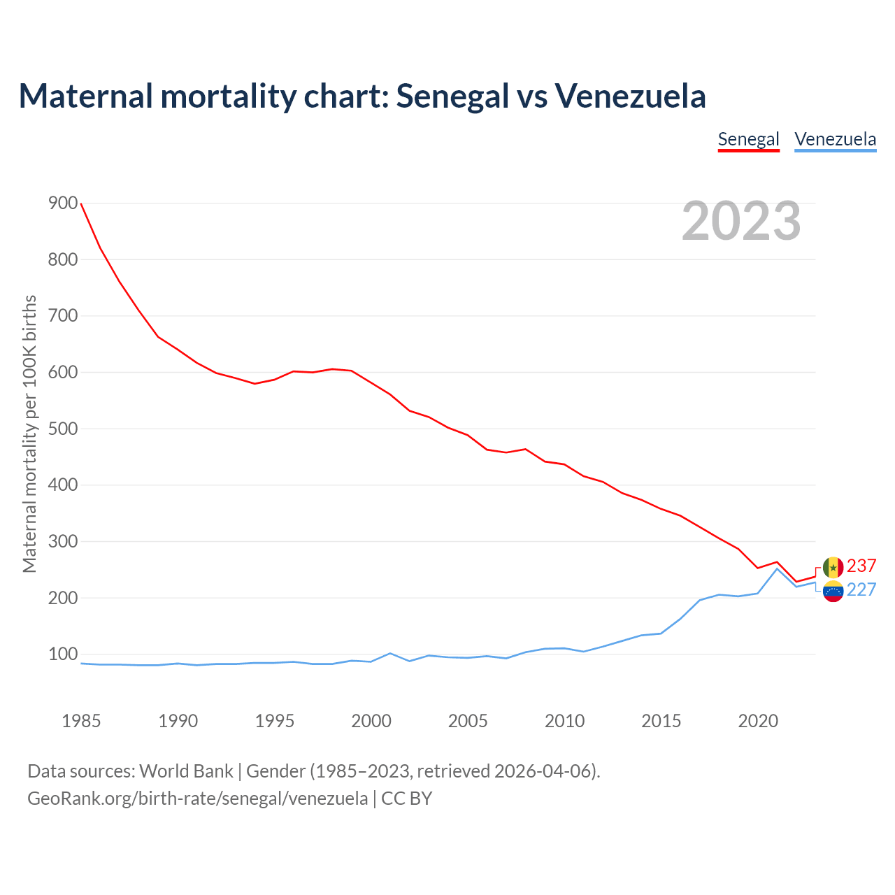 The maternal mortality rate, which is the probability of dying during childbirth or within 42 days of pregnancy termination, is 237 deaths per 100,000 live births in Senegal, compared to 227 deaths in Venezuela.