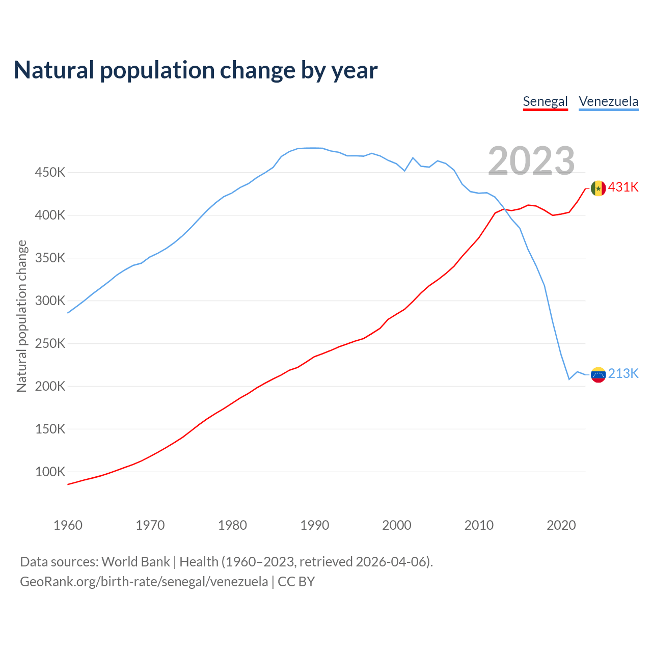 According to the latest available data on birth rates, the fertility rate in Senegal was 3.82 children per woman in 2023, compared to 2.08 in Venezuela in 2023. The replacement level is considered to be 2.1 children per woman.
