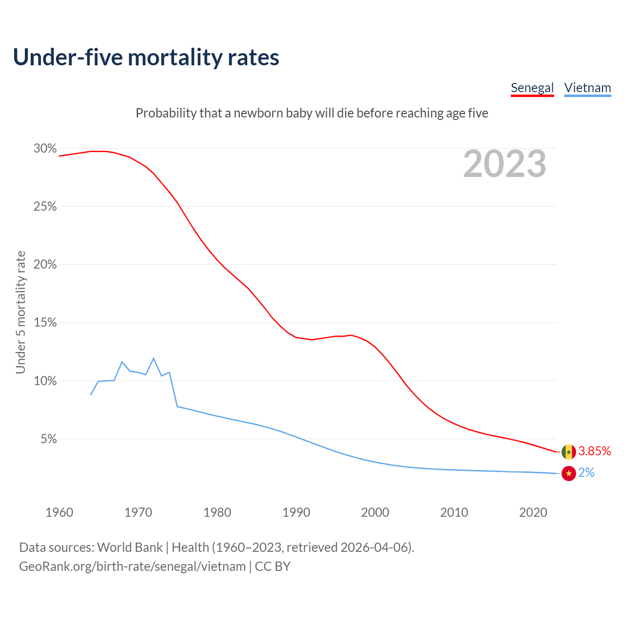 The chance that a newborn baby will die before reaching age five is 3.85% in Senegal and 2% in Vietnam. Above is a chart with historical data on under-five mortality rates.