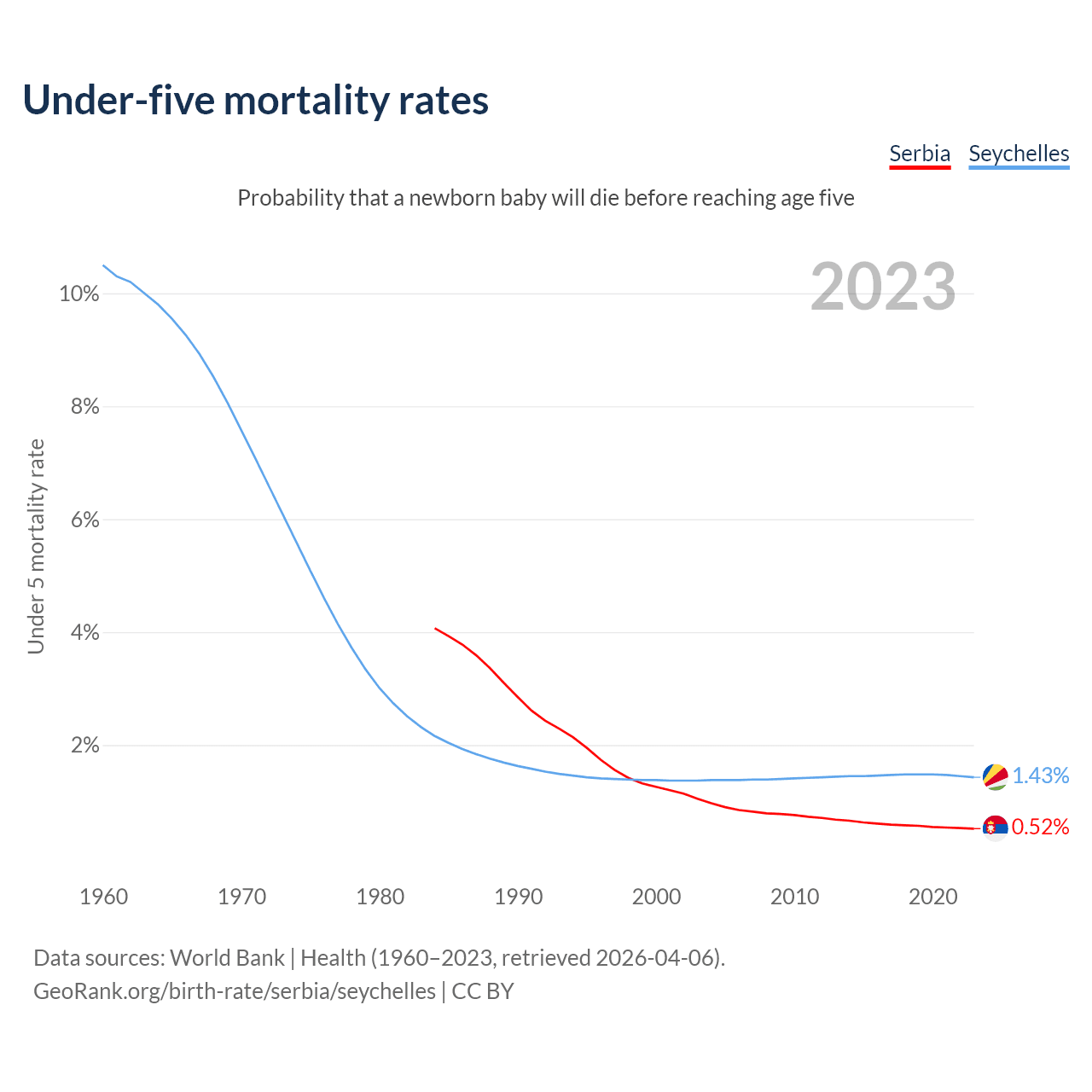 The chance that a newborn baby will die before reaching age five is 0.52% in Serbia and 1.43% in the Seychelles. Above is a chart with historical data on under-five mortality rates.
