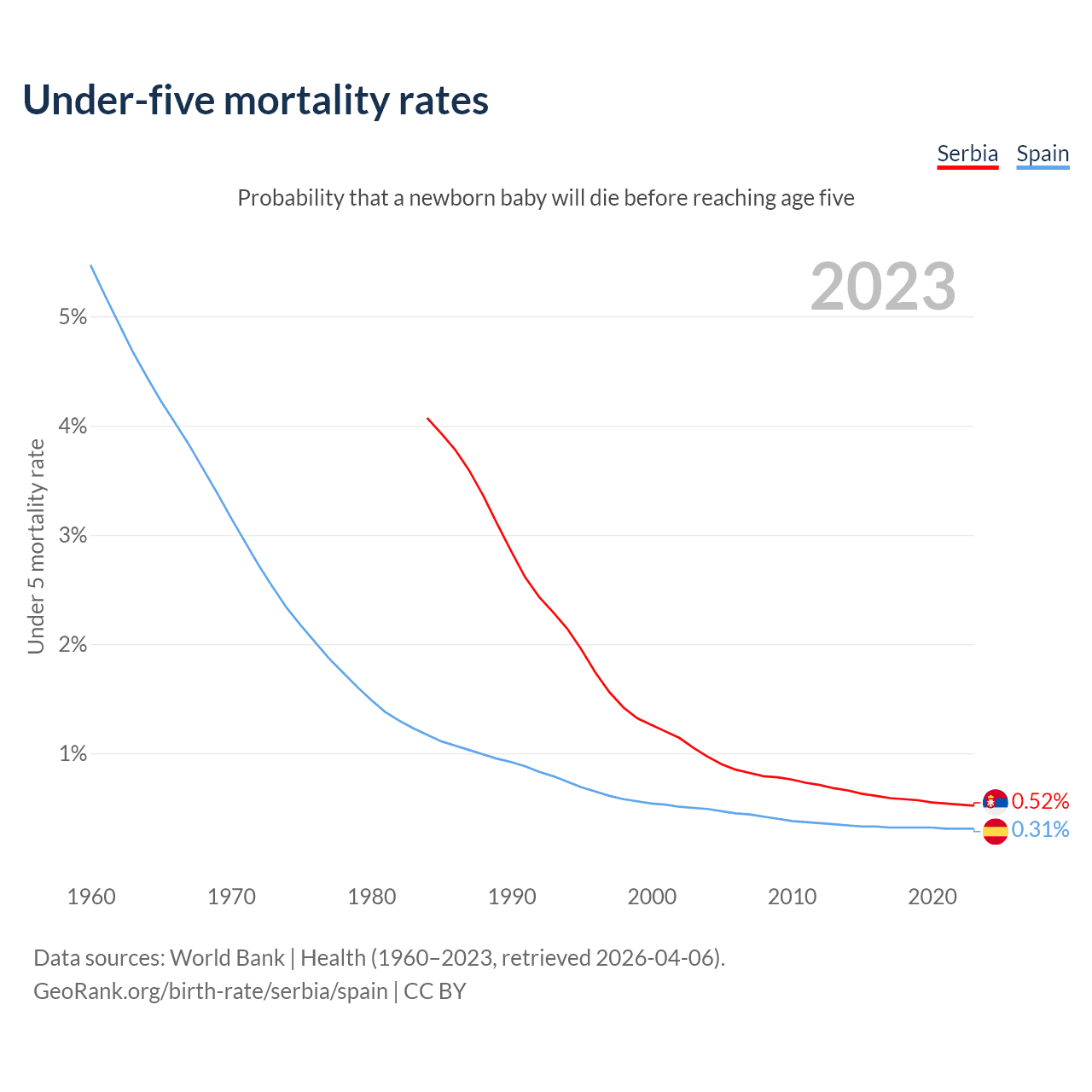 The chance that a newborn baby will die before reaching age five is 0.52% in Serbia and 0.31% in Spain. Above is a chart with historical data on under-five mortality rates.