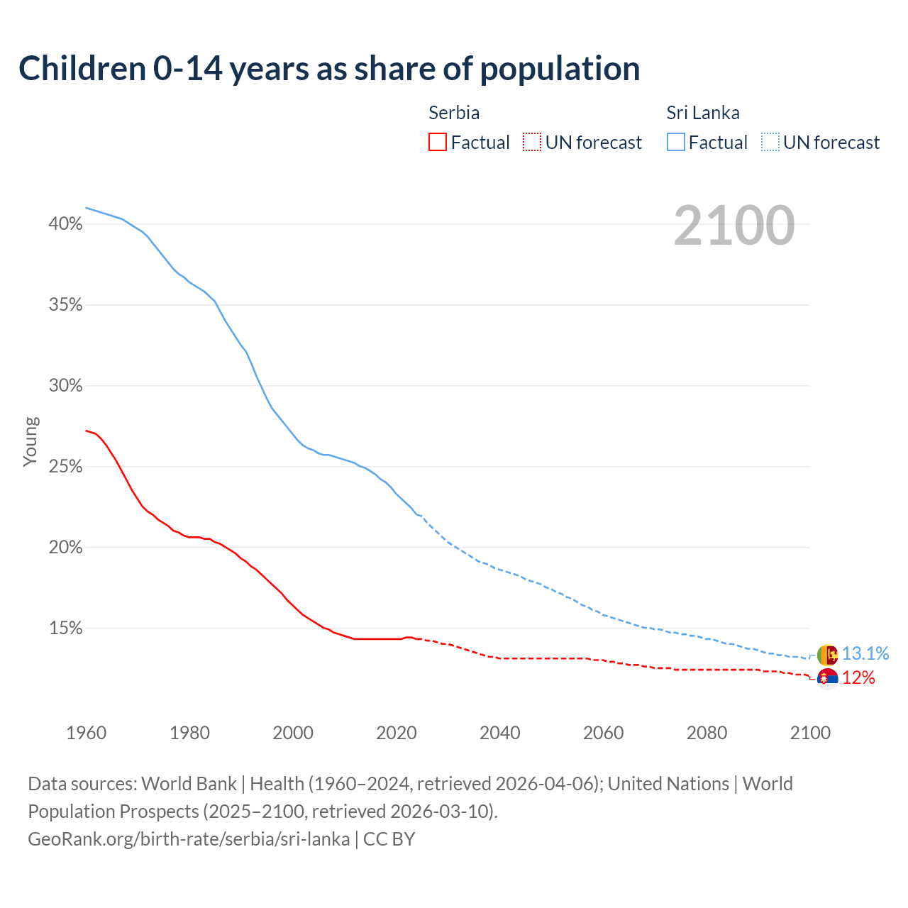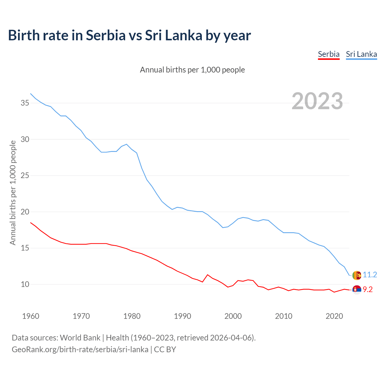 Serbia has an annual birth rate of 9.2 births per 1,000 people, compared to 11.2 for Sri Lanka. The average number of children a woman is expected to have during her lifetime — the fertility rate, is 1.61 in Serbia and 1.97 in Sri Lanka — 22.6% difference.