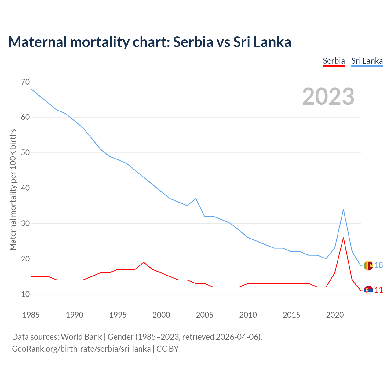 The maternal mortality rate, which is the probability of dying during childbirth or within 42 days of pregnancy termination, is 11 deaths per 100,000 live births in Serbia, compared to 18 deaths in Sri Lanka.