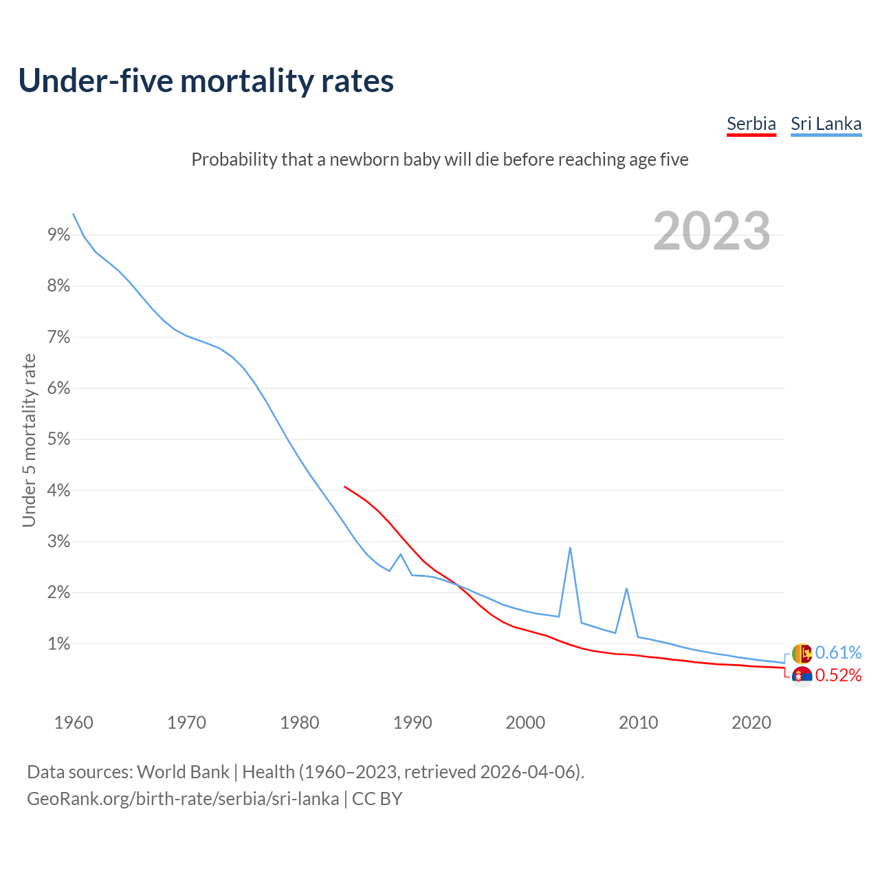 The chance that a newborn baby will die before reaching age five is 0.52% in Serbia and 0.61% in Sri Lanka. Above is a chart with historical data on under-five mortality rates.