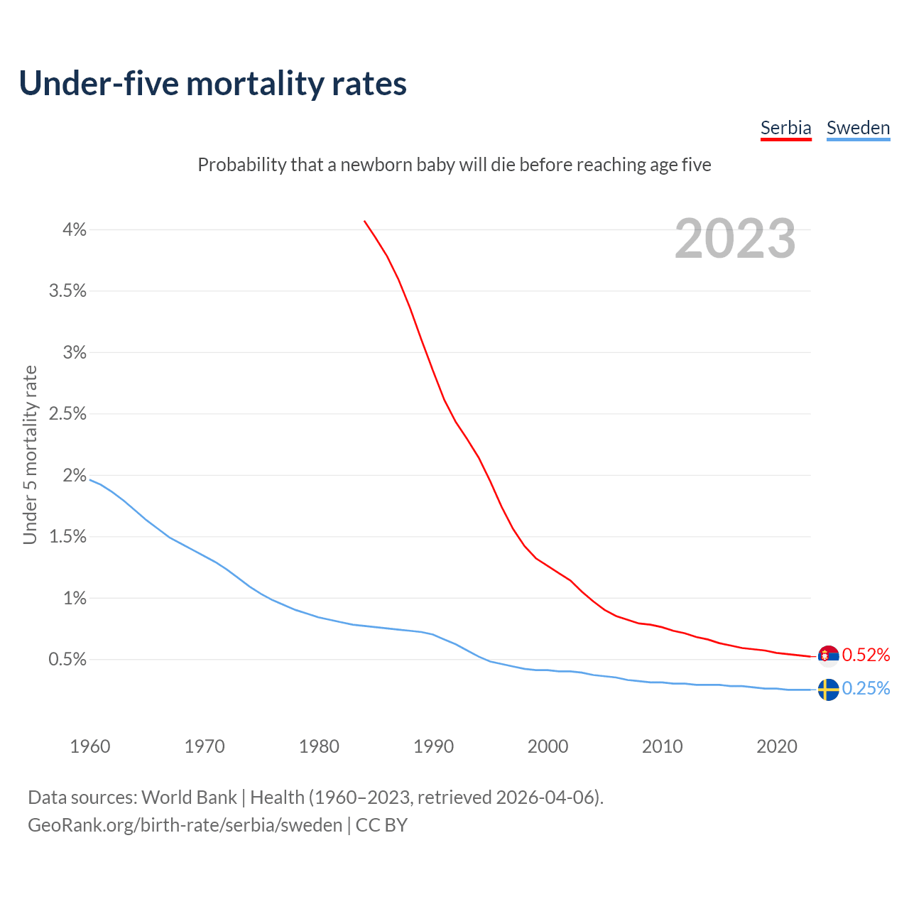 The chance that a newborn baby will die before reaching age five is 0.52% in Serbia and 0.25% in Sweden. Above is a chart with historical data on under-five mortality rates.