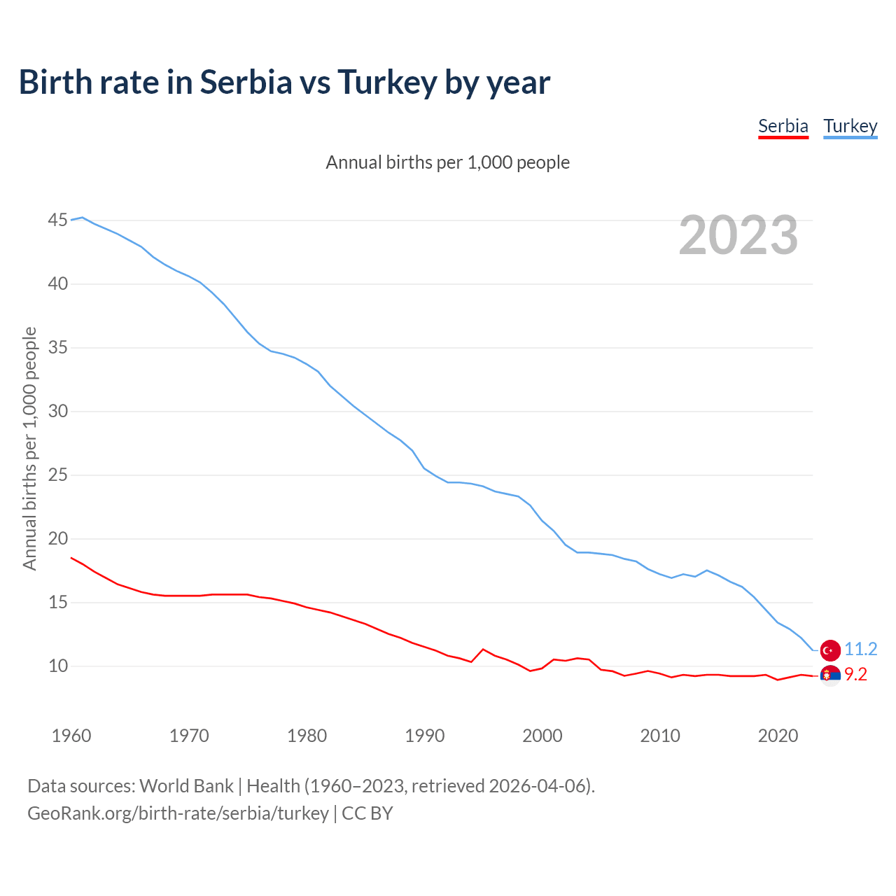 According to the latest available data on birth rates, the fertility rate in Serbia was 1.61 children per woman in 2023, compared to 1.51 in Turkey in 2023. The replacement level is considered to be 2.1 children per woman.
