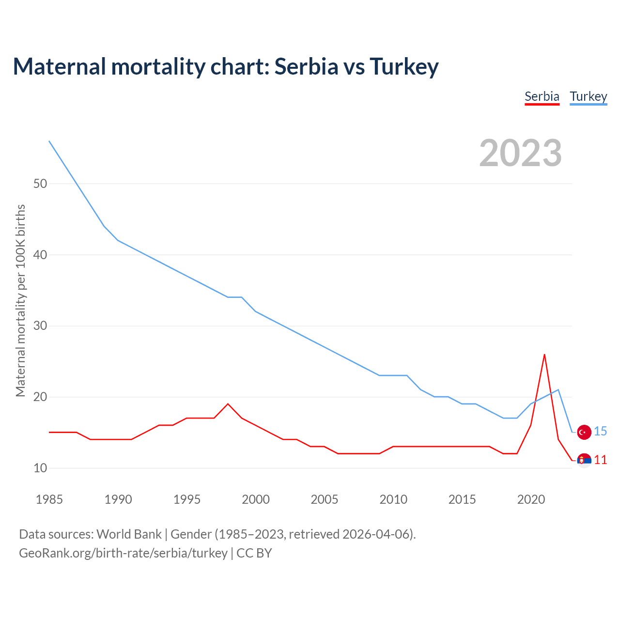 The maternal mortality rate, which is the probability of dying during childbirth or within 42 days of pregnancy termination, is 11 deaths per 100,000 live births in Serbia, compared to 15 deaths in Turkey.
