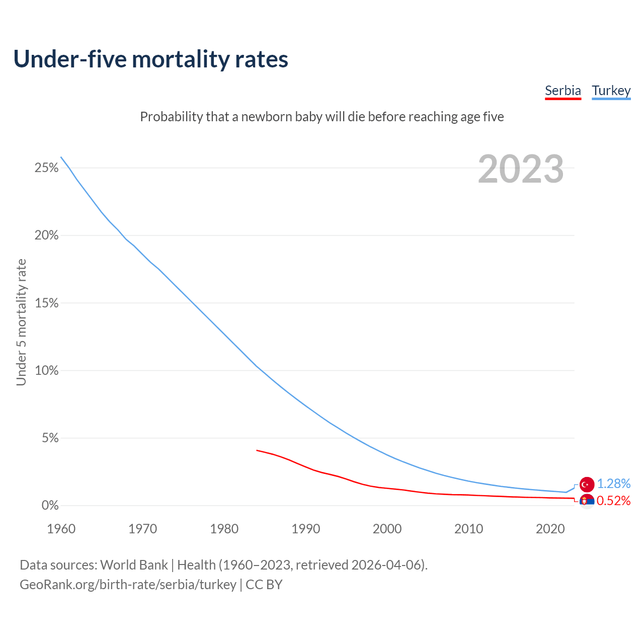 The chance that a newborn baby will die before reaching age five is 0.52% in Serbia and 1.28% in Turkey. Above is a chart with historical data on under-five mortality rates.