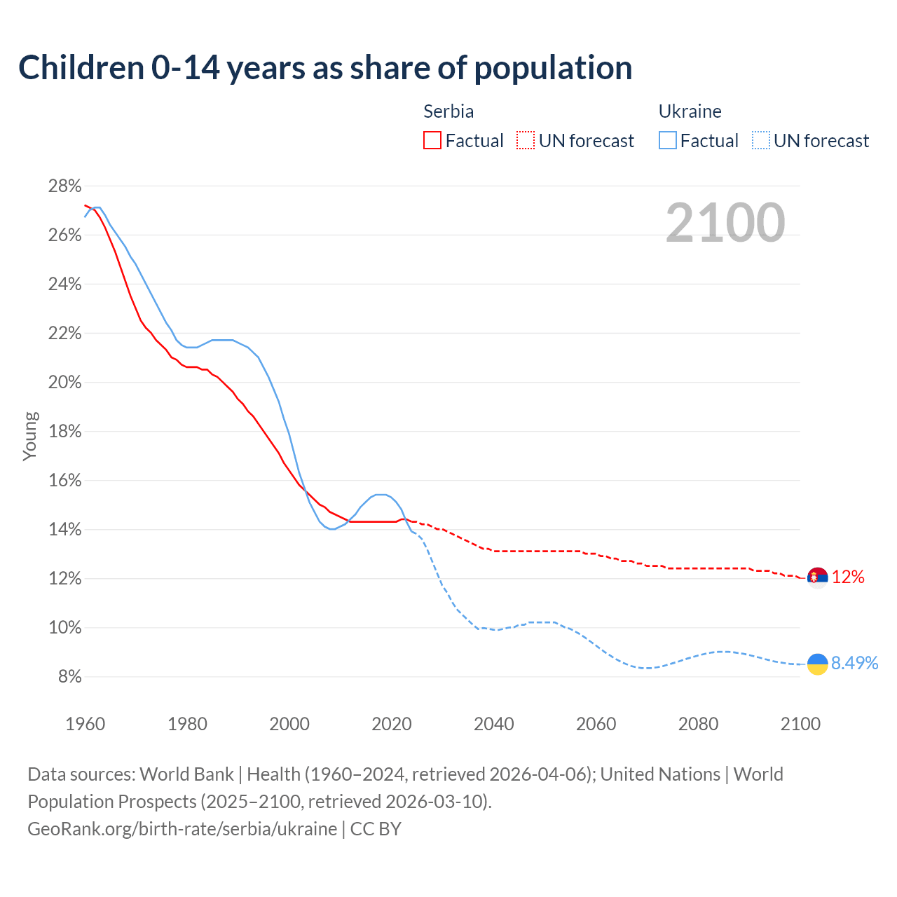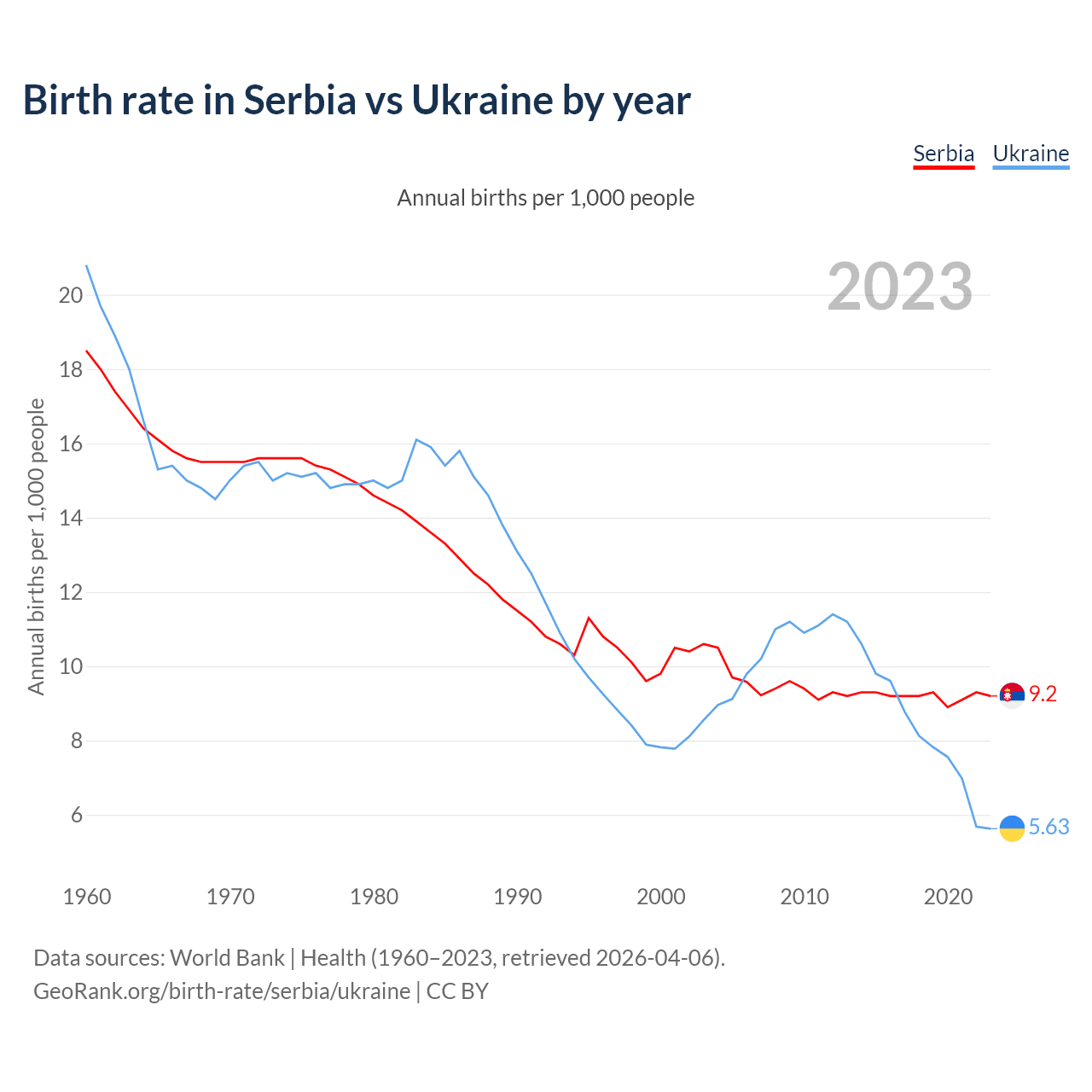 Serbia has an annual birth rate of 9.2 births per 1,000 people, compared to 5.63 for Ukraine. The average number of children a woman is expected to have during her lifetime — the fertility rate, is 1.61 in Serbia and 0.98 in Ukraine — 39.3% difference.