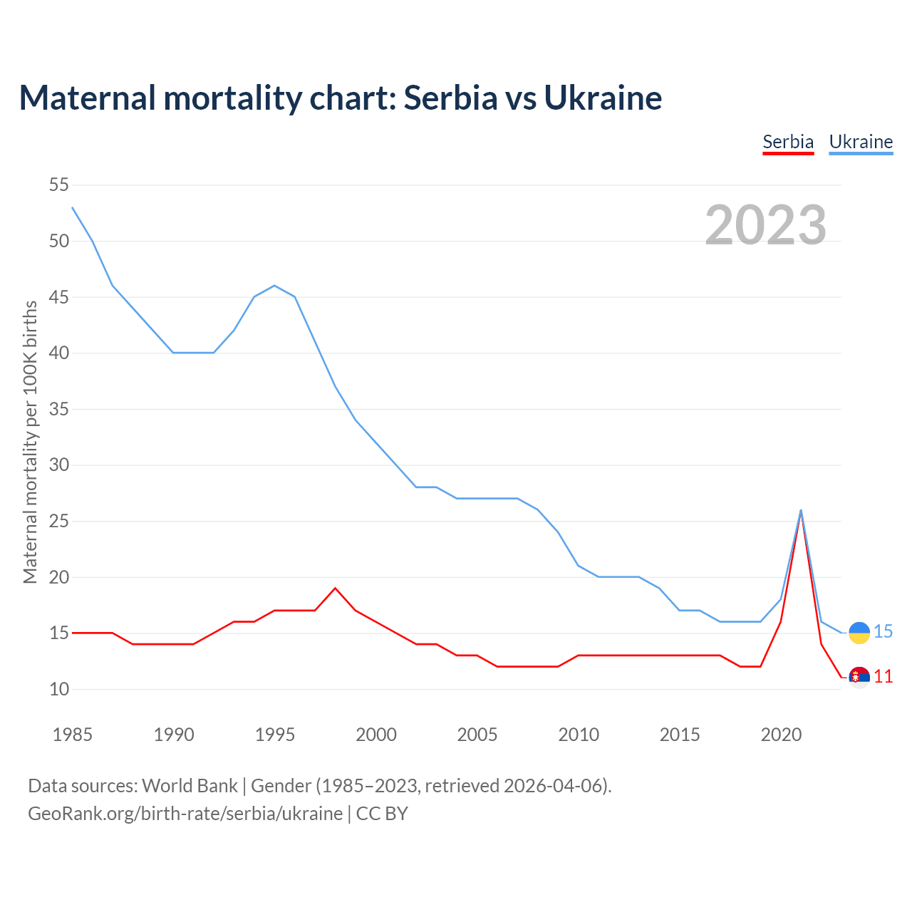 The maternal mortality rate, which is the probability of dying during childbirth or within 42 days of pregnancy termination, is 11 deaths per 100,000 live births in Serbia, compared to 15 deaths in Ukraine.