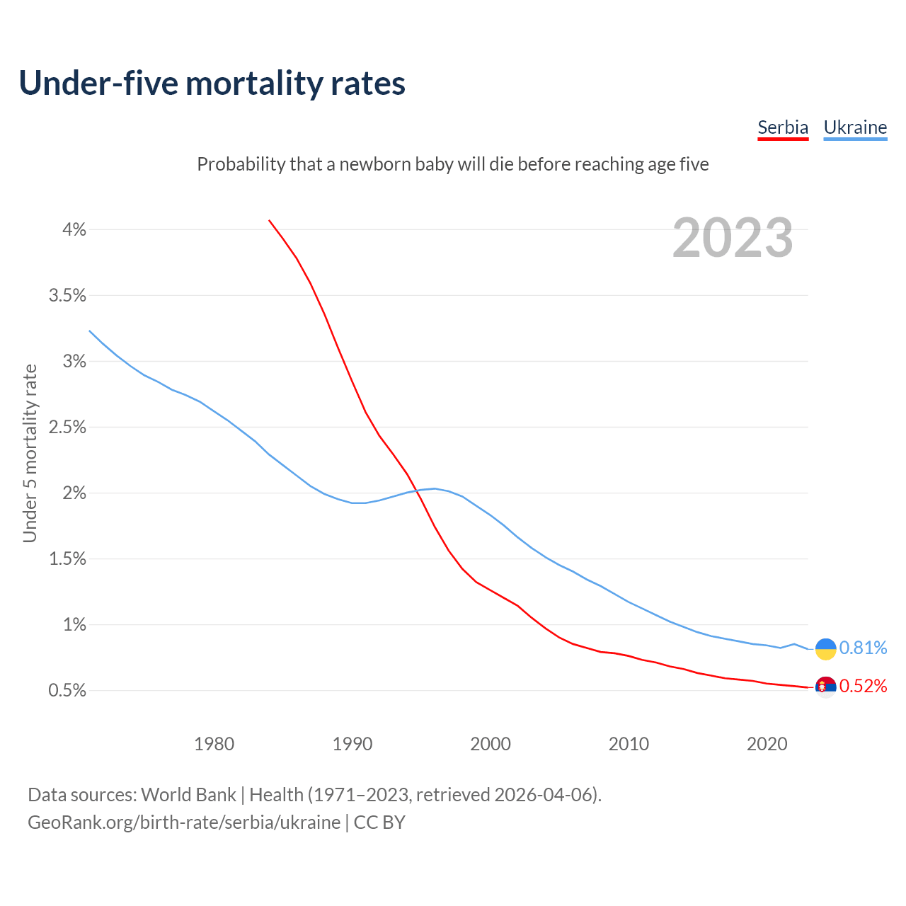 The chance that a newborn baby will die before reaching age five is 0.52% in Serbia and 0.81% in Ukraine. Above is a chart with historical data on under-five mortality rates.