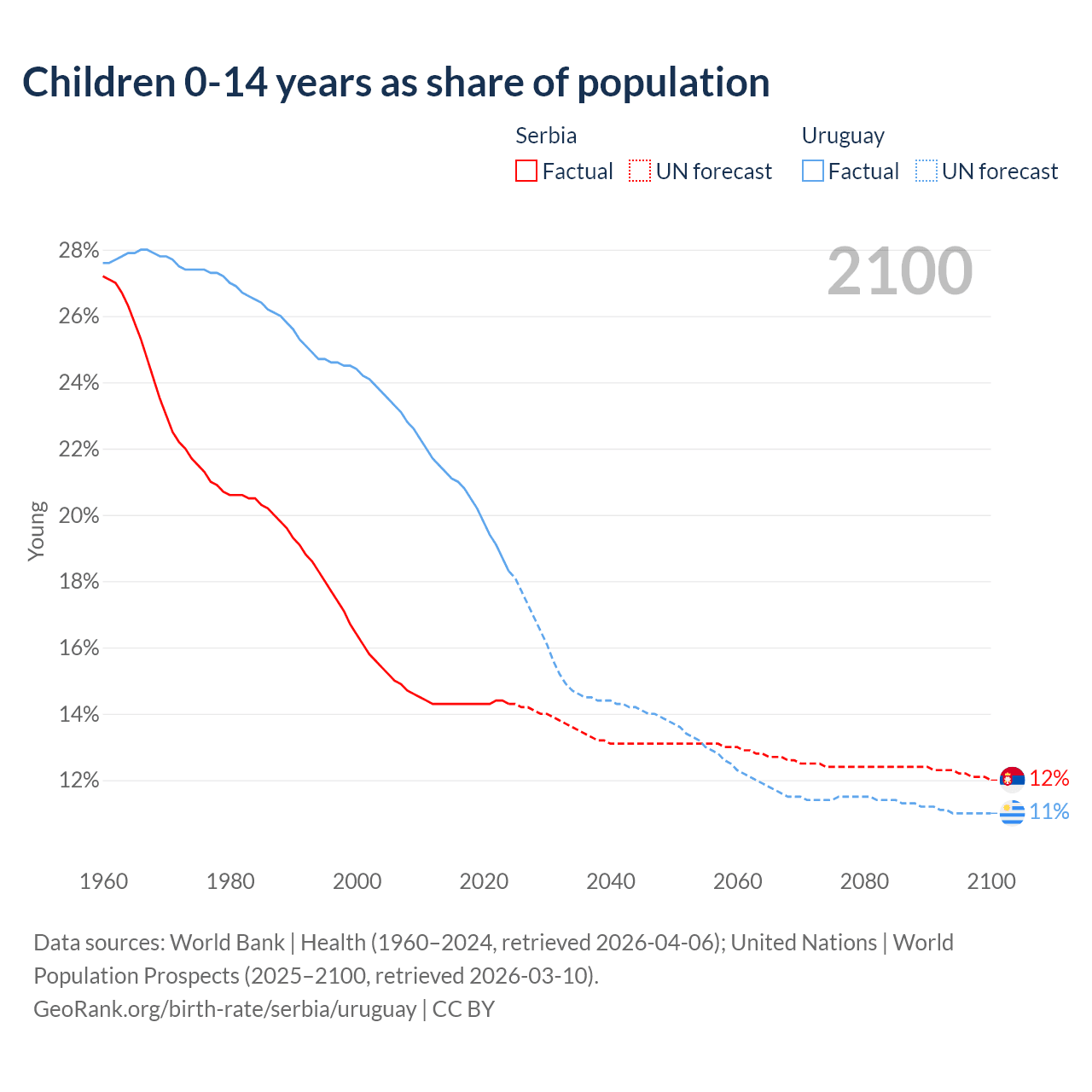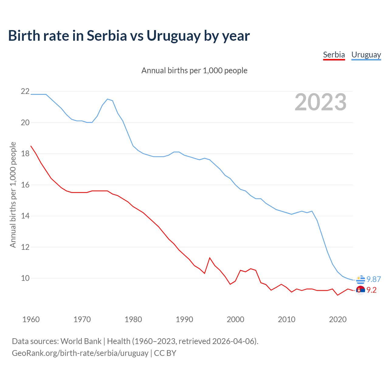 Serbia has an annual birth rate of 9.2 births per 1,000 people, compared to 9.87 for Uruguay. The average number of children a woman is expected to have during her lifetime — the fertility rate, is 1.61 in Serbia and 1.41 in Uruguay — 12.5% difference.