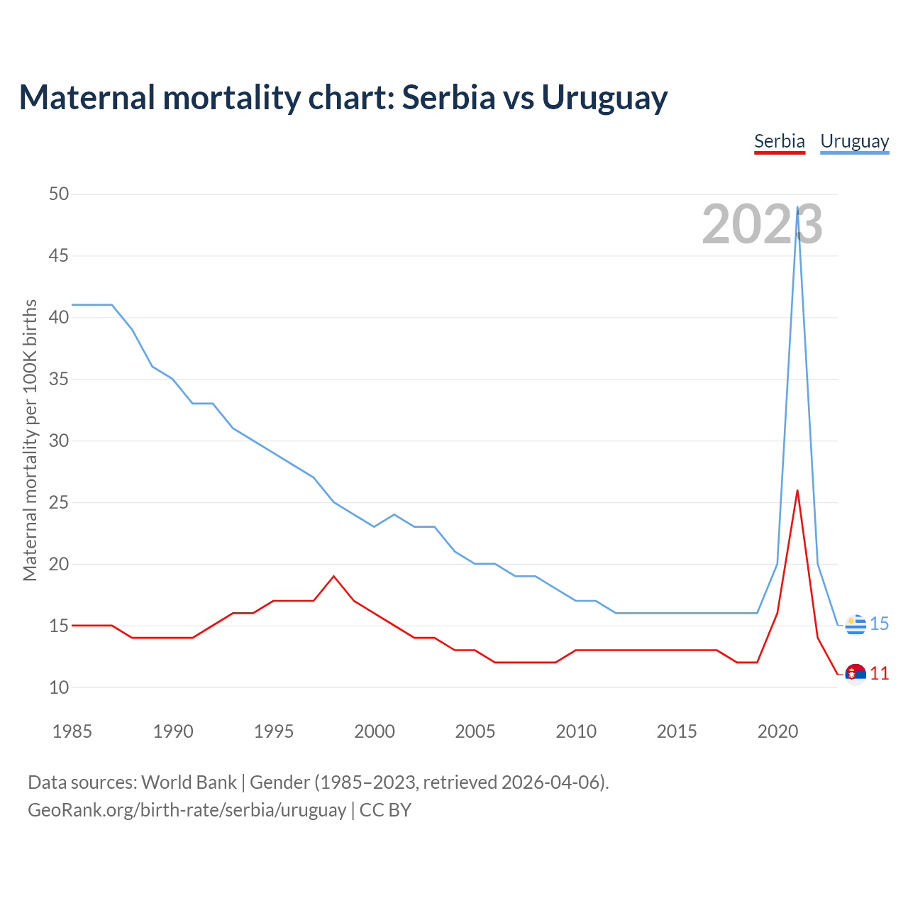The maternal mortality rate, which is the probability of dying during childbirth or within 42 days of pregnancy termination, is 11 deaths per 100,000 live births in Serbia, compared to 15 deaths in Uruguay.