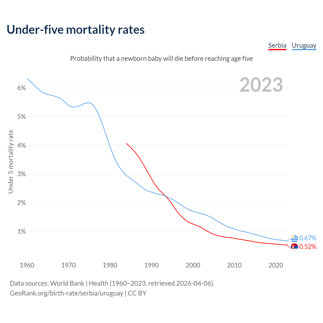 The chance that a newborn baby will die before reaching age five is 0.52% in Serbia and 0.67% in Uruguay. Above is a chart with historical data on under-five mortality rates.