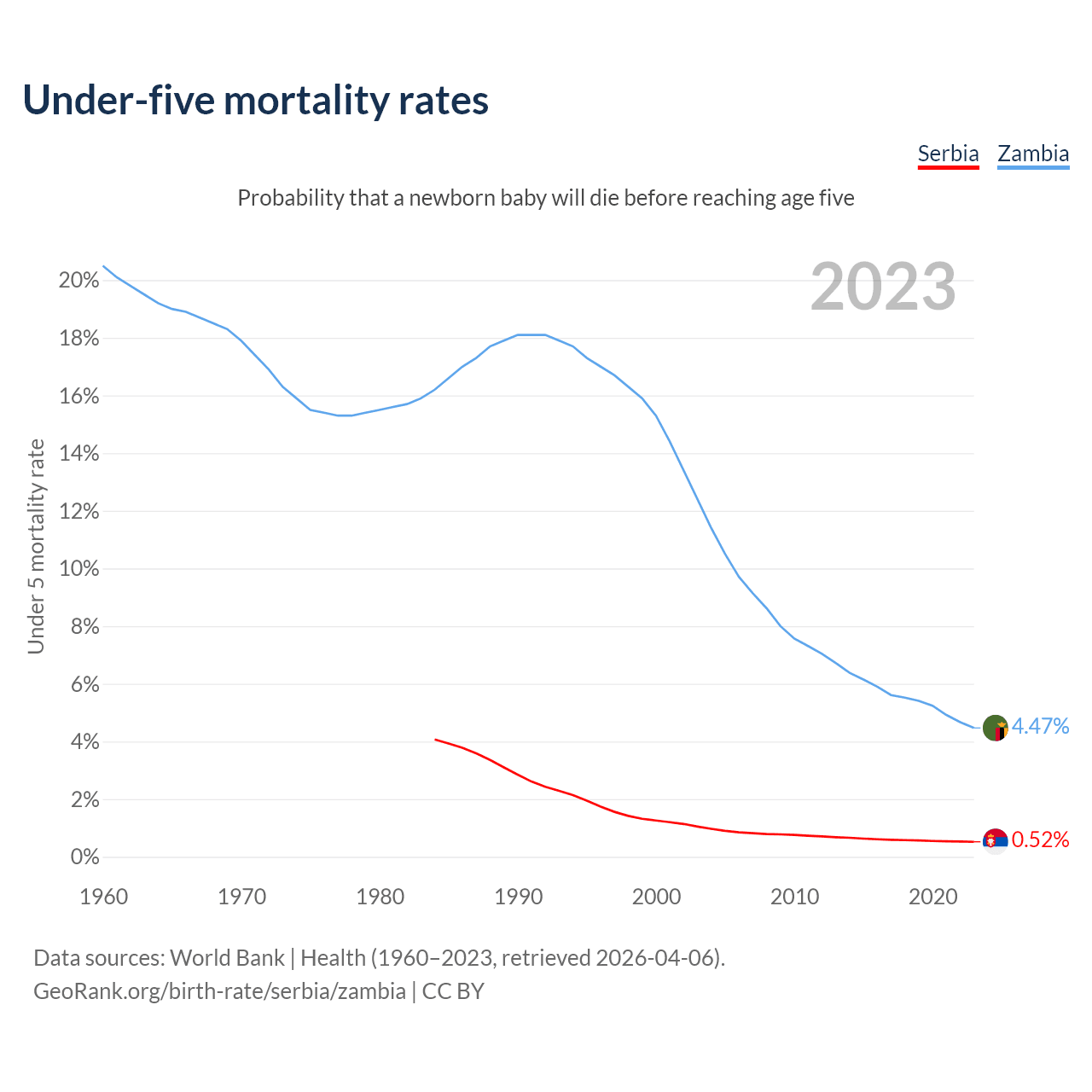 The chance that a newborn baby will die before reaching age five is 0.52% in Serbia and 4.47% in Zambia. Above is a chart with historical data on under-five mortality rates.