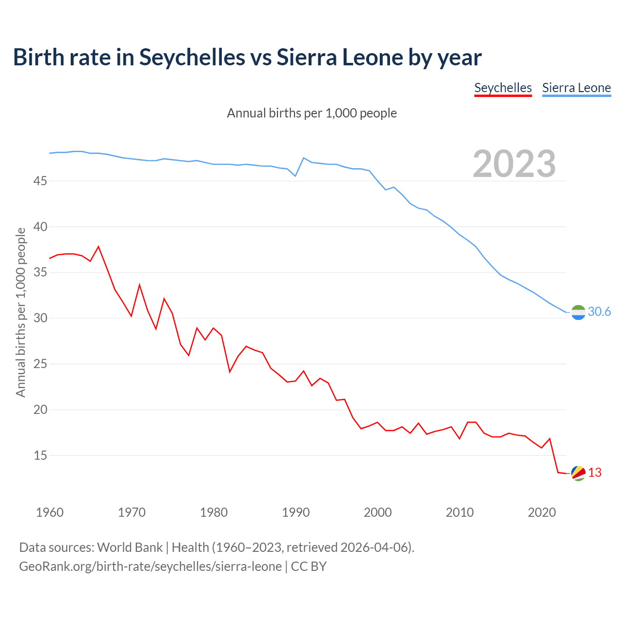 The Seychelles has an annual birth rate of 13 births per 1,000 people, compared to 30.6 for Sierra Leone. The average number of children a woman is expected to have during her lifetime — the fertility rate, is 2.02 in the Seychelles and 3.79 in Sierra Leone — 87.7% difference.