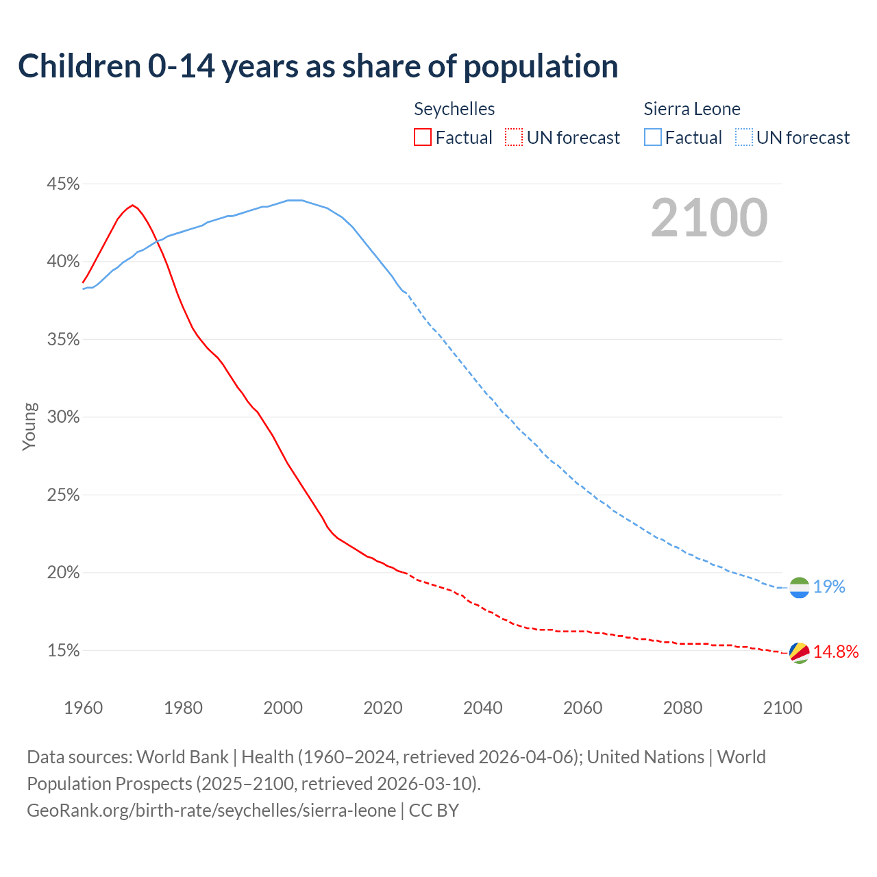 According to the latest available data on birth rates, the fertility rate in the Seychelles was 2.02 children per woman in 2023, compared to 3.79 in Sierra Leone in 2023. The replacement level is considered to be 2.1 children per woman.