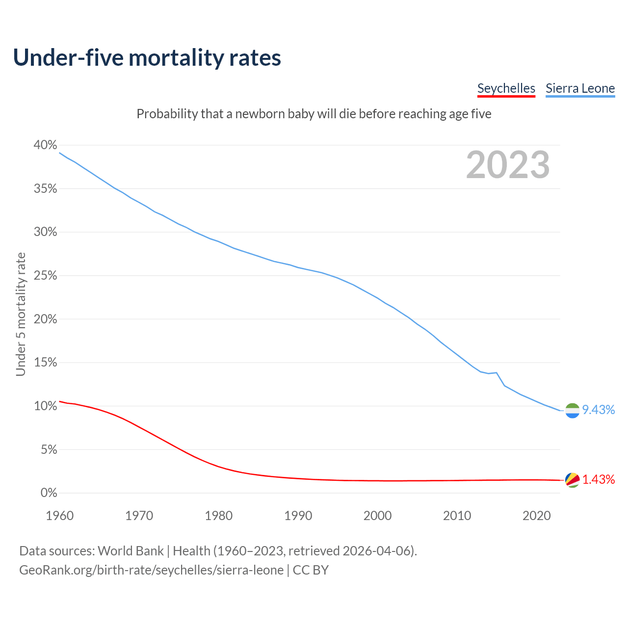 The chance that a newborn baby will die before reaching age five is 1.43% in the Seychelles and 9.43% in Sierra Leone. Above is a chart with historical data on under-five mortality rates.