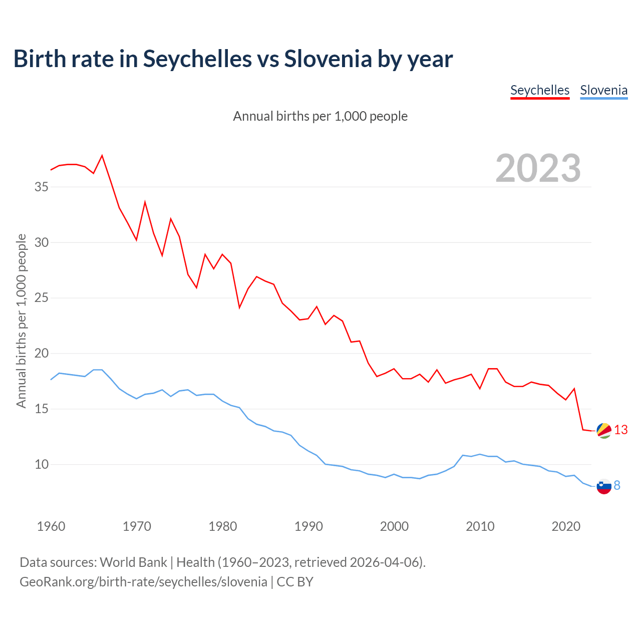 The Seychelles has an annual birth rate of 13 births per 1,000 people, compared to 8 for Slovenia. The average number of children a woman is expected to have during her lifetime — the fertility rate, is 2.02 in the Seychelles and 1.51 in Slovenia — 25.2% difference.
