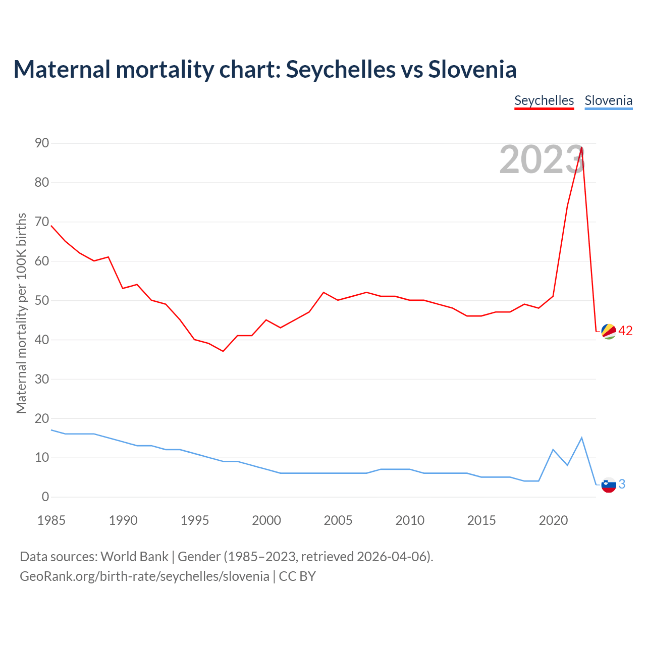 The maternal mortality rate, which is the probability of dying during childbirth or within 42 days of pregnancy termination, is 42 deaths per 100,000 live births in the Seychelles, compared to 3 deaths in Slovenia.
