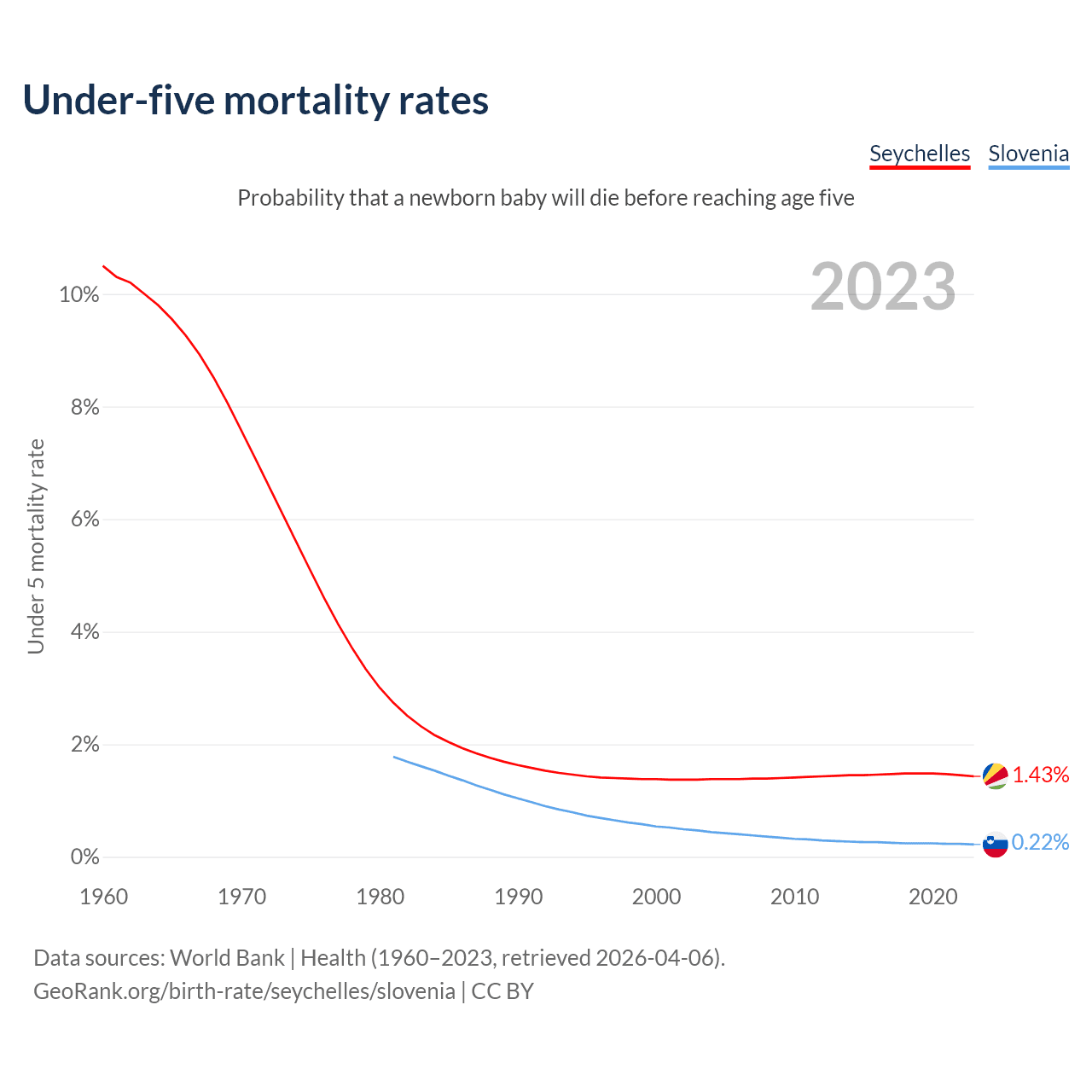 The chance that a newborn baby will die before reaching age five is 1.43% in the Seychelles and 0.22% in Slovenia. Above is a chart with historical data on under-five mortality rates.