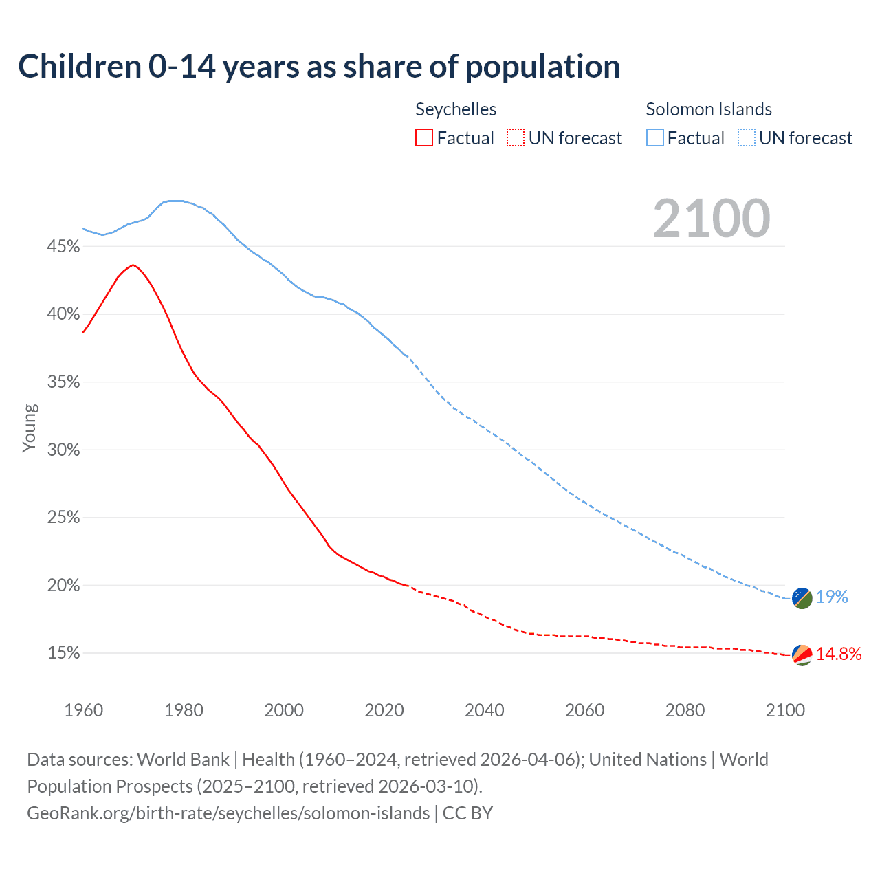 According to the latest available data on birth rates, the fertility rate in the Seychelles was 2.02 children per woman in 2023, compared to 3.56 in the Solomon Islands in 2023. The replacement level is considered to be 2.1 children per woman.