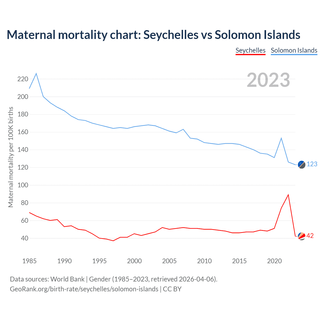 The maternal mortality rate, which is the probability of dying during childbirth or within 42 days of pregnancy termination, is 42 deaths per 100,000 live births in the Seychelles, compared to 123 deaths in the Solomon Islands.