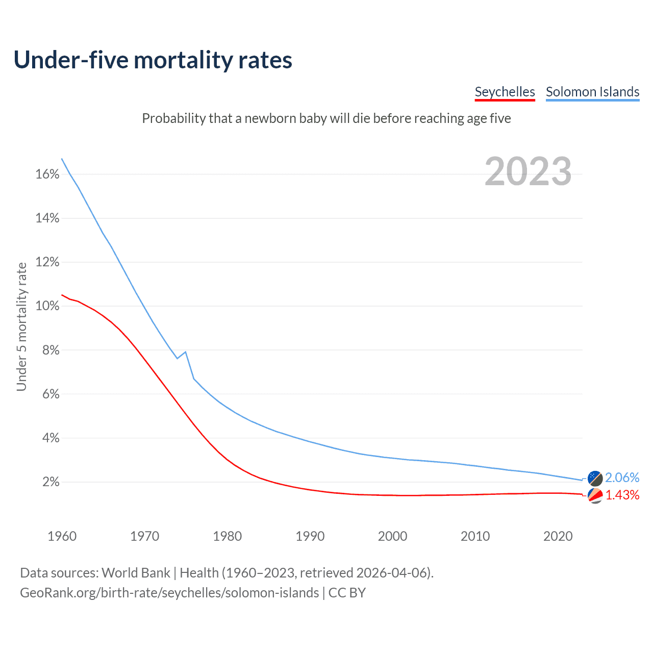 The chance that a newborn baby will die before reaching age five is 1.43% in the Seychelles and 2.06% in the Solomon Islands. Above is a chart with historical data on under-five mortality rates.