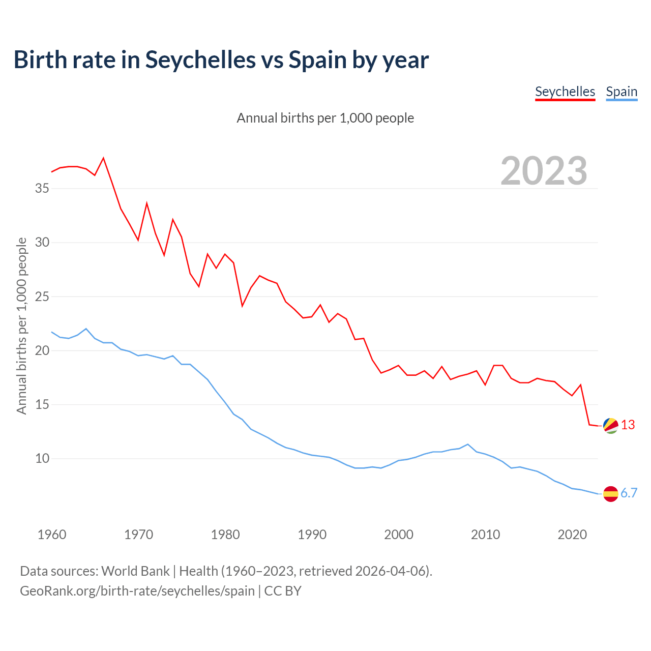 The Seychelles has an annual birth rate of 13 births per 1,000 people, compared to 6.7 for Spain. The average number of children a woman is expected to have during her lifetime — the fertility rate, is 2.02 in the Seychelles and 1.12 in Spain — 44.6% difference.
