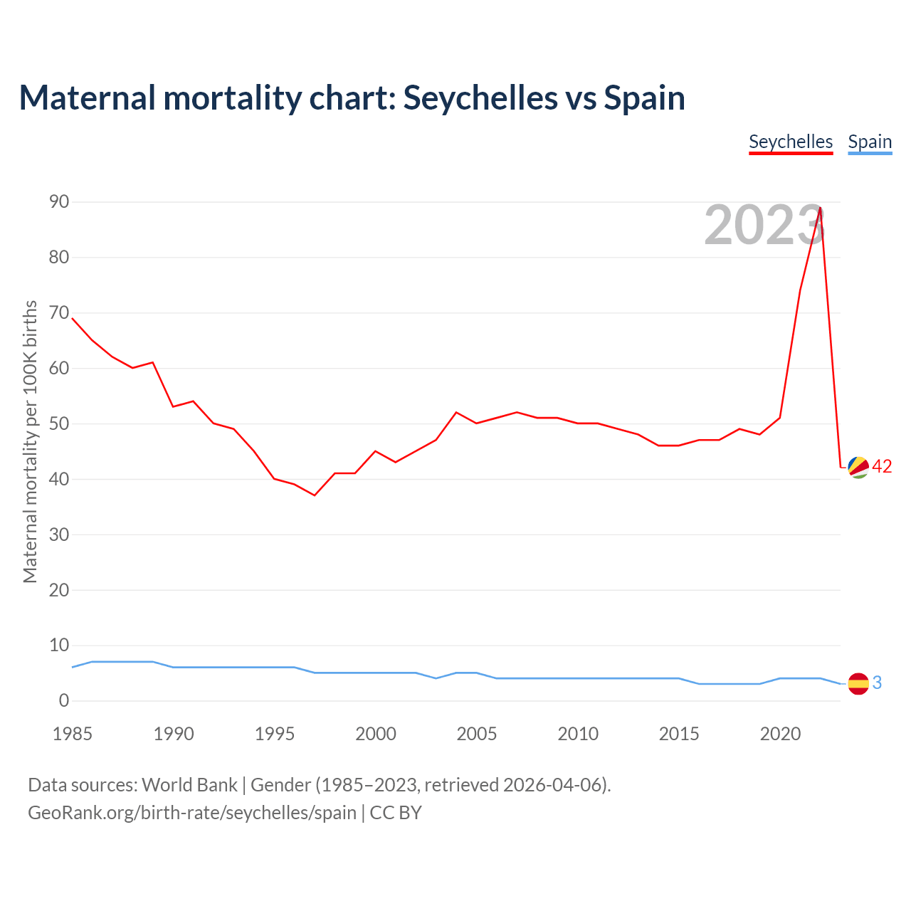 The maternal mortality rate, which is the probability of dying during childbirth or within 42 days of pregnancy termination, is 42 deaths per 100,000 live births in the Seychelles, compared to 3 deaths in Spain.