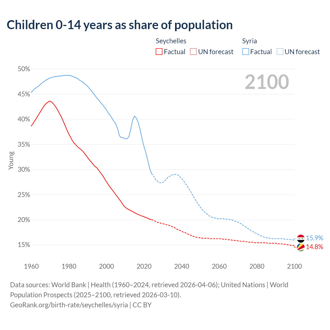 According to the latest available data on birth rates, the fertility rate in the Seychelles was 2.02 children per woman in 2023, compared to 2.71 in Syria in 2023. The replacement level is considered to be 2.1 children per woman.
