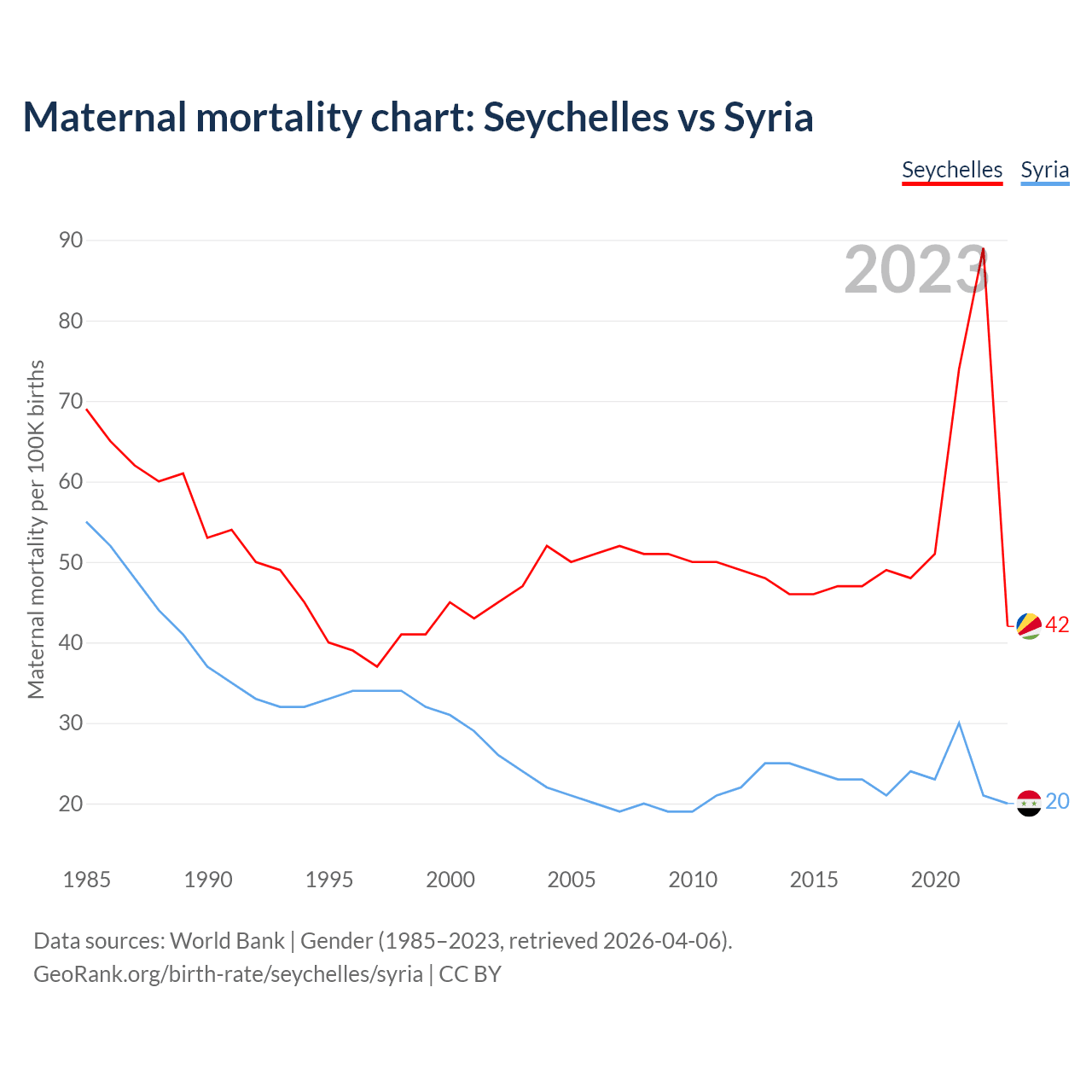 The maternal mortality rate, which is the probability of dying during childbirth or within 42 days of pregnancy termination, is 42 deaths per 100,000 live births in the Seychelles, compared to 20 deaths in Syria.