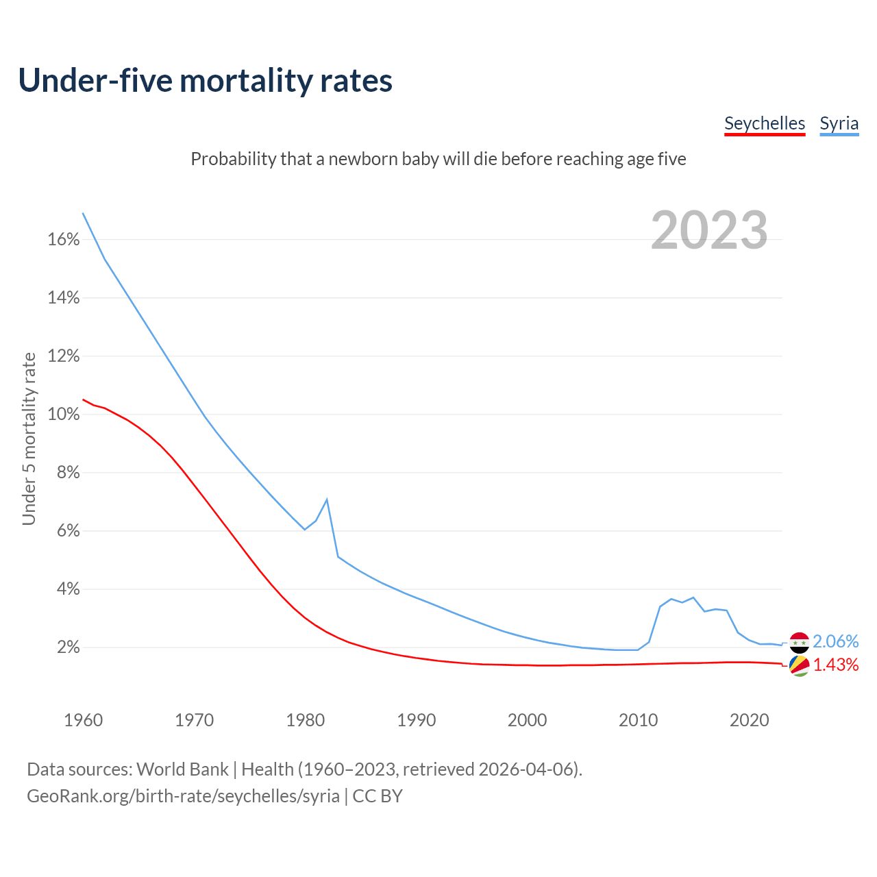 The chance that a newborn baby will die before reaching age five is 1.43% in the Seychelles and 2.06% in Syria. Above is a chart with historical data on under-five mortality rates.