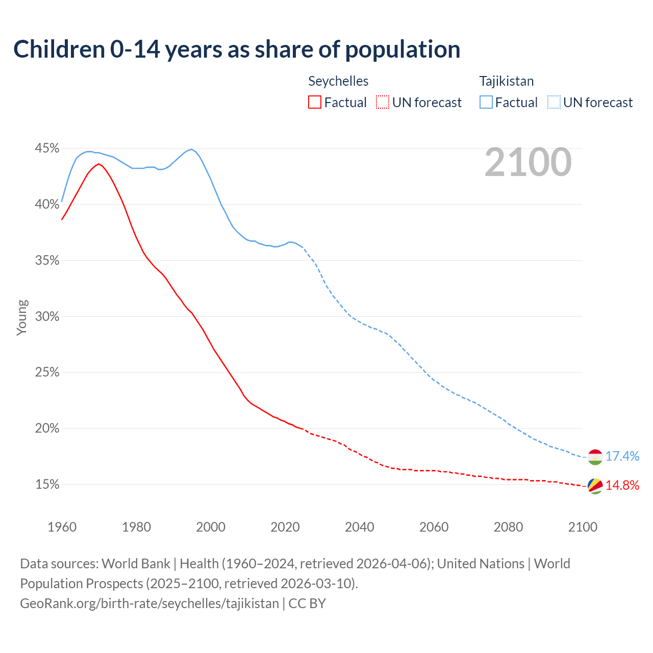 According to the latest available data on birth rates, the fertility rate in the Seychelles was 2.02 children per woman in 2023, compared to 3.07 in Tajikistan in 2023. The replacement level is considered to be 2.1 children per woman.
