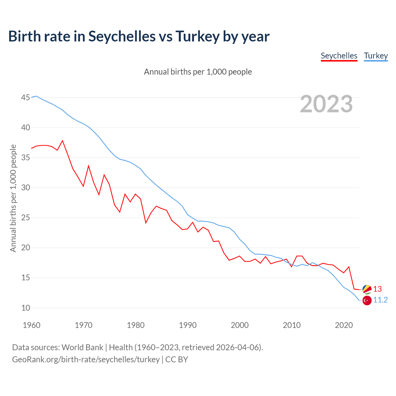 The Seychelles has an annual birth rate of 13 births per 1,000 people, compared to 11.2 for Turkey. The average number of children a woman is expected to have during her lifetime — the fertility rate, is 2.02 in the Seychelles and 1.51 in Turkey — 25.2% difference.