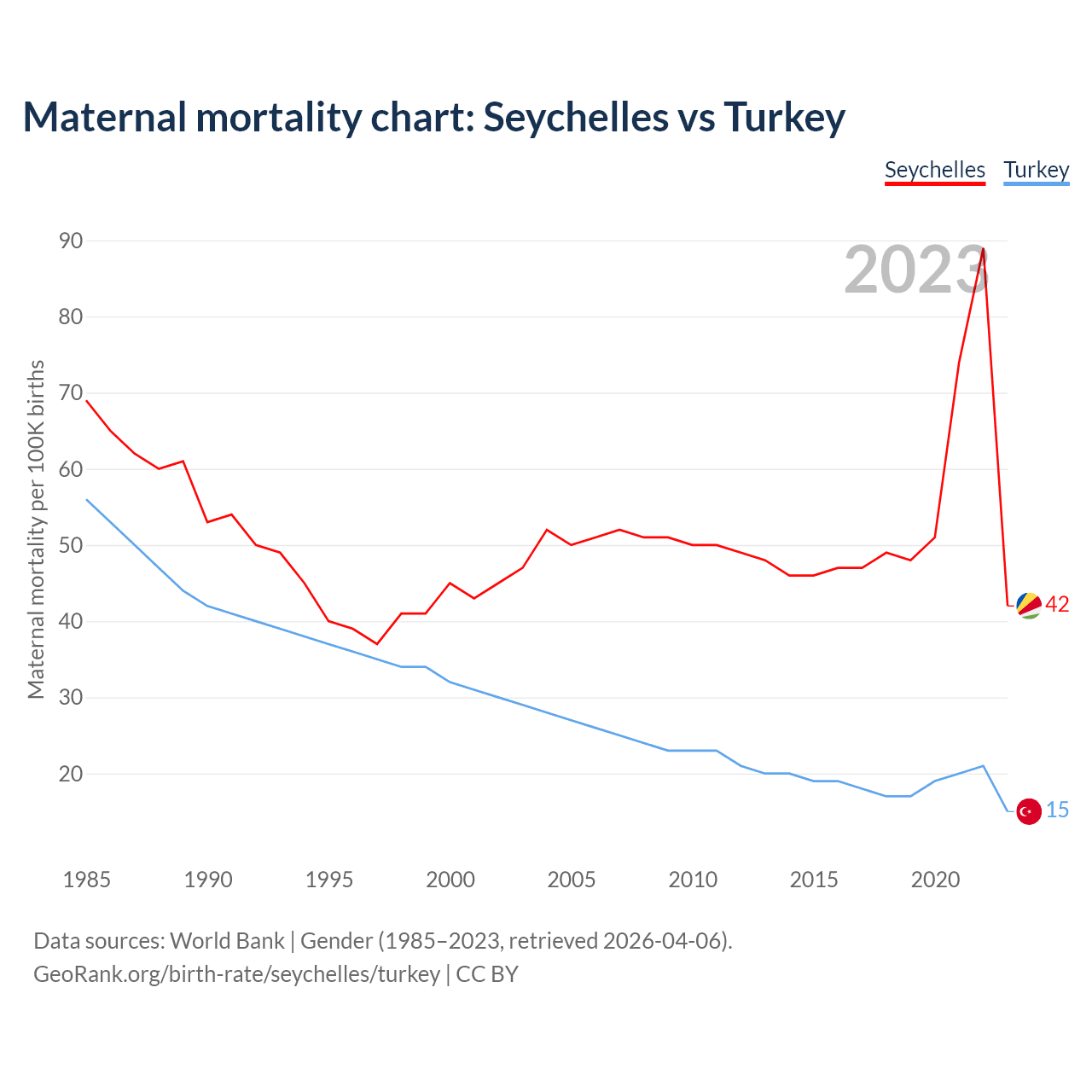 The maternal mortality rate, which is the probability of dying during childbirth or within 42 days of pregnancy termination, is 42 deaths per 100,000 live births in the Seychelles, compared to 15 deaths in Turkey.