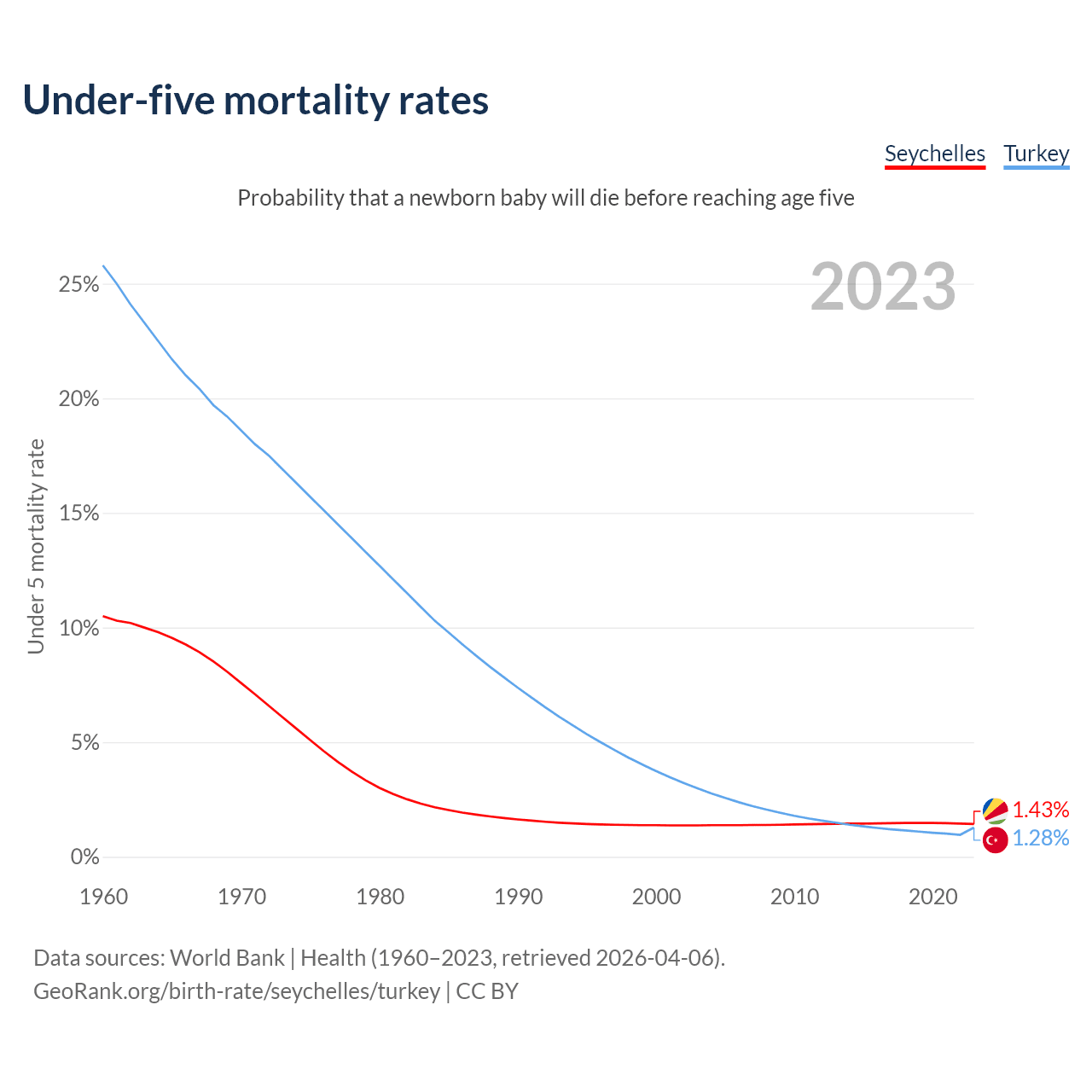 The chance that a newborn baby will die before reaching age five is 1.43% in the Seychelles and 1.28% in Turkey. Above is a chart with historical data on under-five mortality rates.