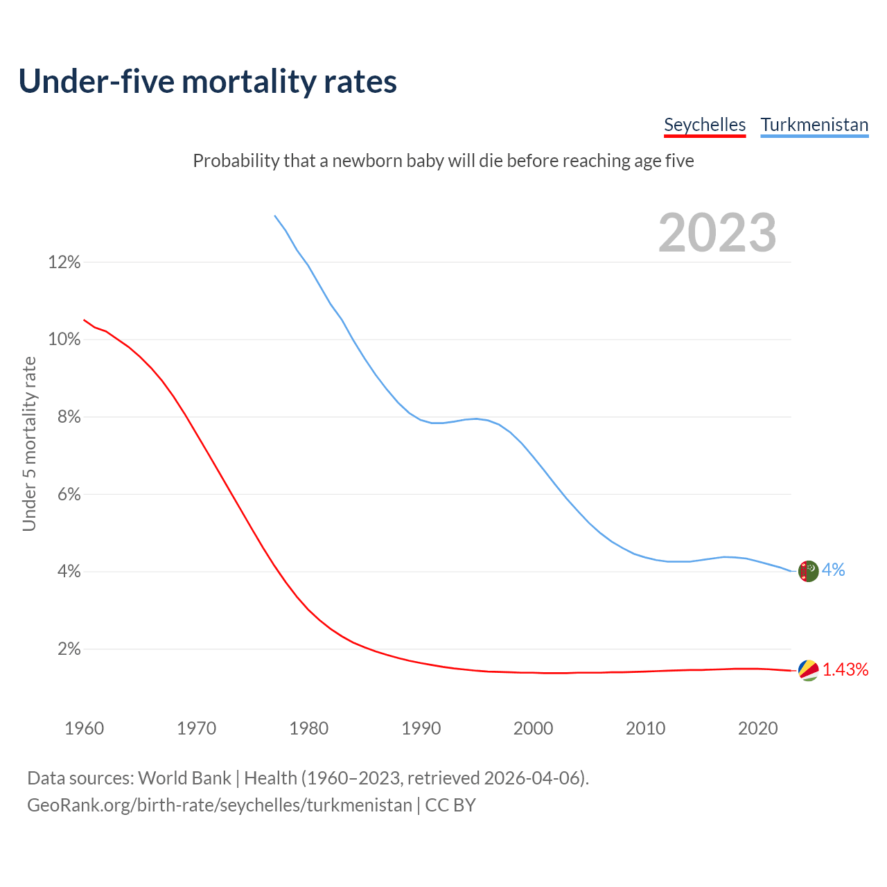 The chance that a newborn baby will die before reaching age five is 1.43% in the Seychelles and 4% in Turkmenistan. Above is a chart with historical data on under-five mortality rates.