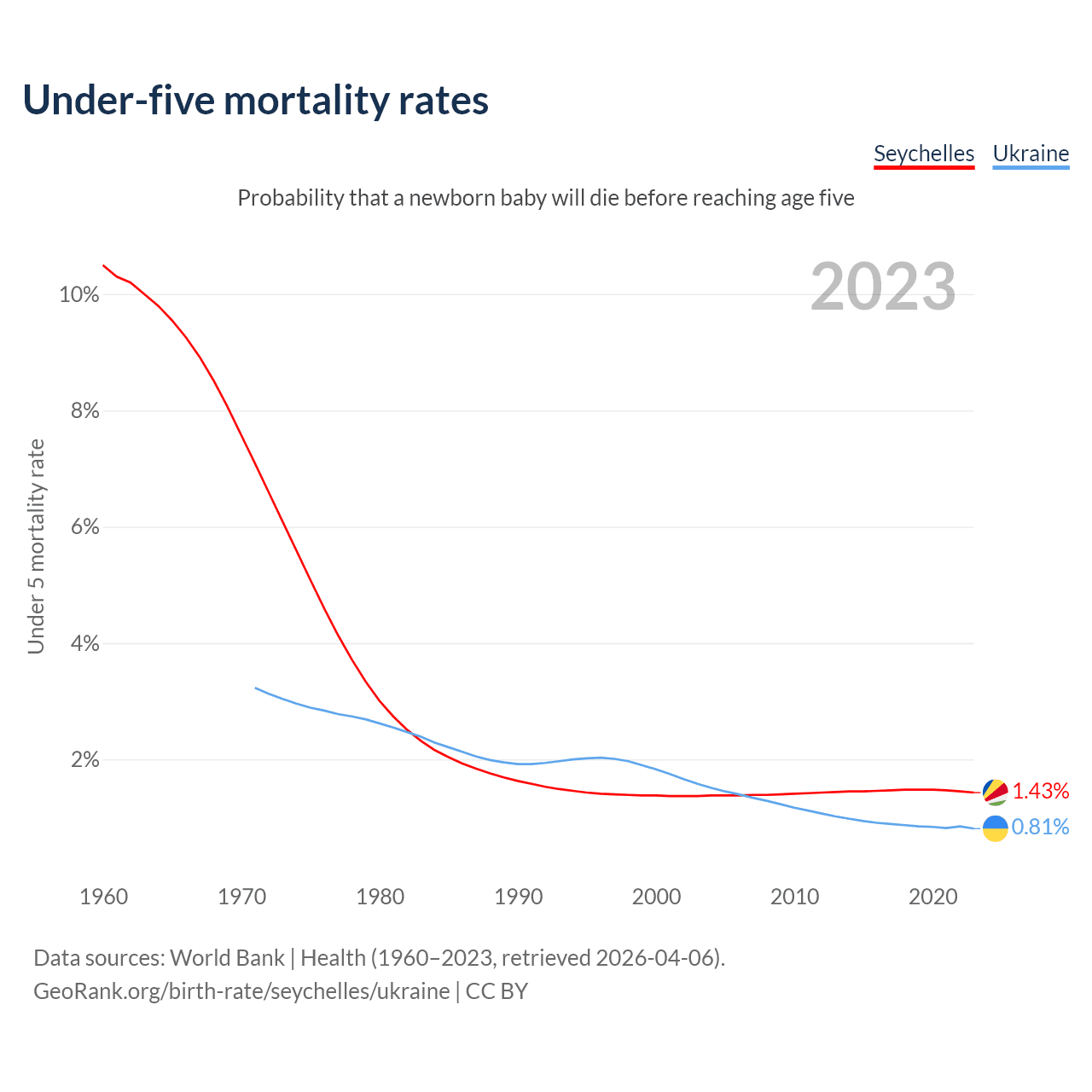 The chance that a newborn baby will die before reaching age five is 1.43% in the Seychelles and 0.81% in Ukraine. Above is a chart with historical data on under-five mortality rates.