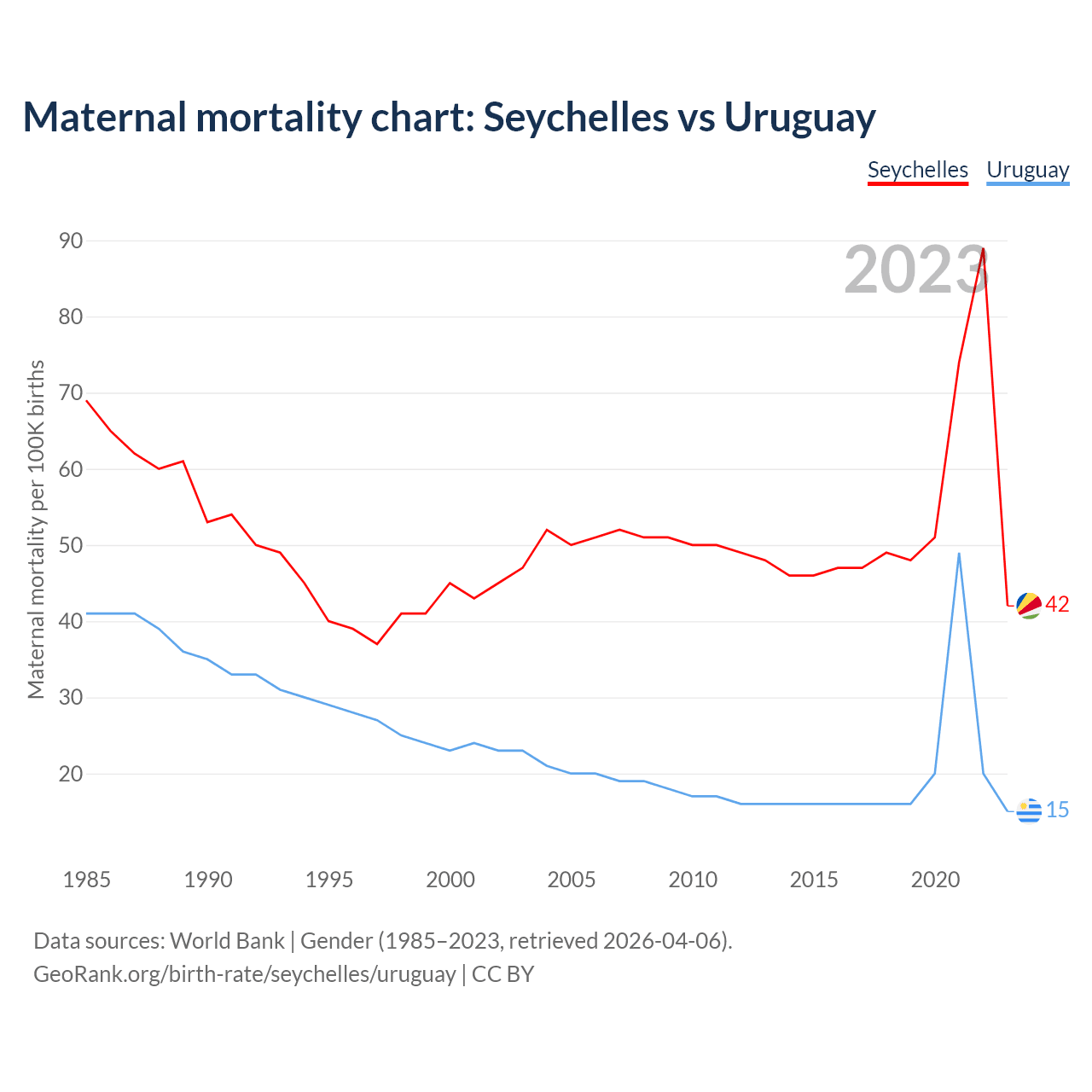 The maternal mortality rate, which is the probability of dying during childbirth or within 42 days of pregnancy termination, is 42 deaths per 100,000 live births in the Seychelles, compared to 15 deaths in Uruguay.