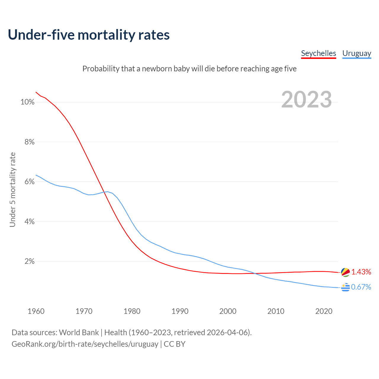 The chance that a newborn baby will die before reaching age five is 1.43% in the Seychelles and 0.67% in Uruguay. Above is a chart with historical data on under-five mortality rates.