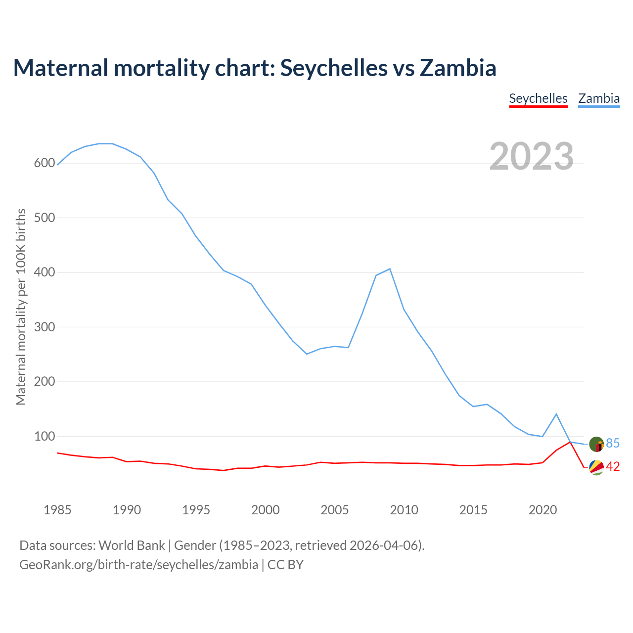 The maternal mortality rate, which is the probability of dying during childbirth or within 42 days of pregnancy termination, is 42 deaths per 100,000 live births in the Seychelles, compared to 85 deaths in Zambia.