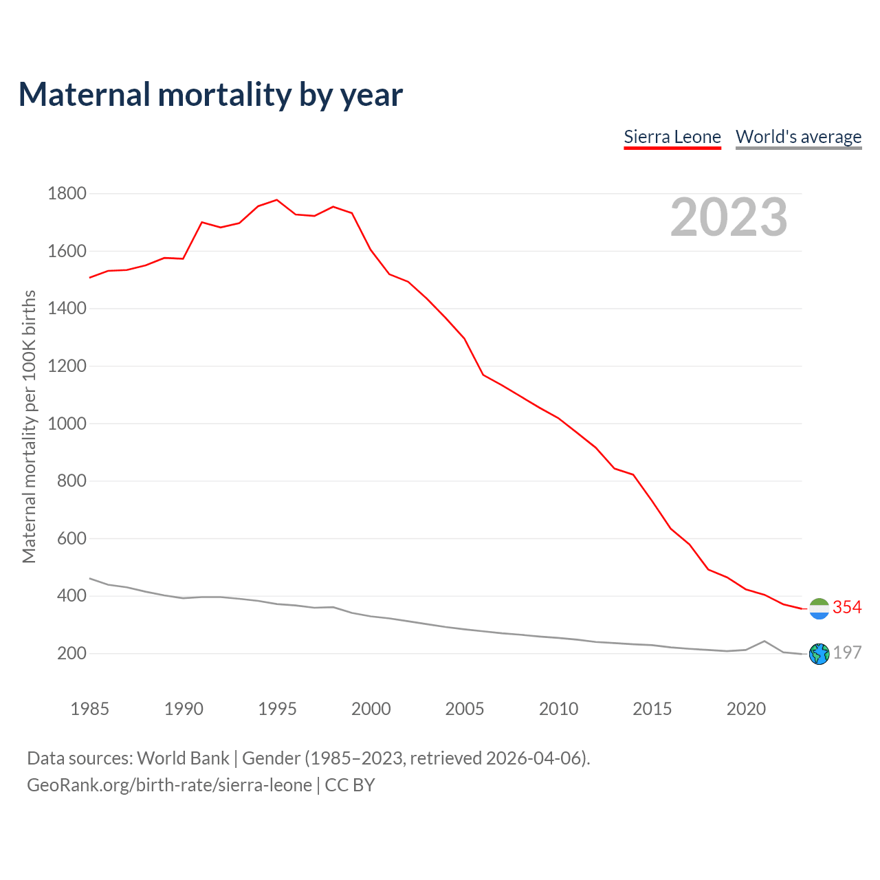 The maternal mortality rate in Sierra Leone was 354 deaths per 100,000 live births in 2023 — a 0.35% chance of dying during childbirth or within 42 days of pregnancy termination. This is a 77.9% decrease compared to the year 2000.