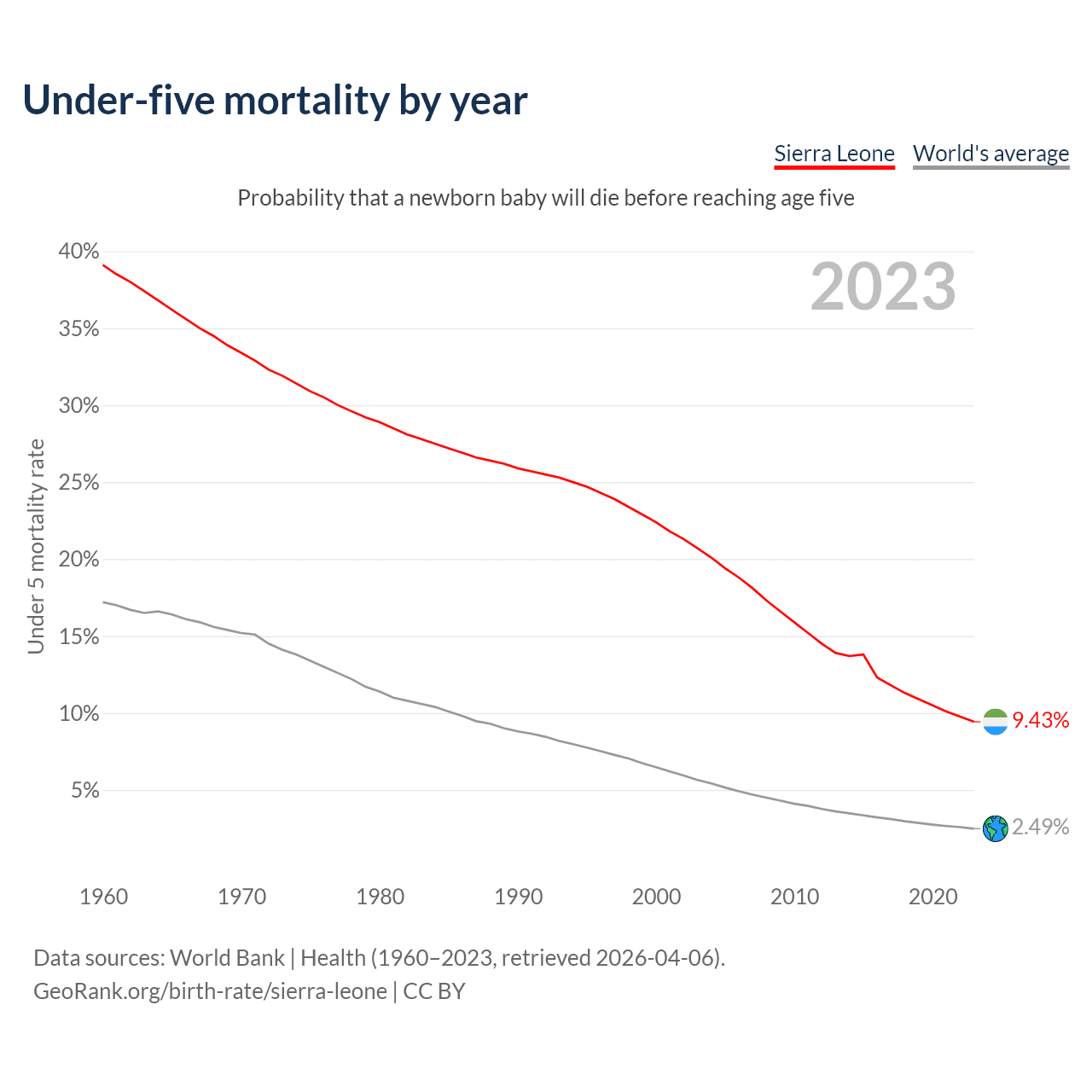 The under-5 mortality rate in Sierra Leone was 94.3 deaths per 1,000 live births in 2023 — a 9.43% chance that a newborn baby will die before reaching age five. This is down from 223.7 deaths per 1,000 live births in 2000.