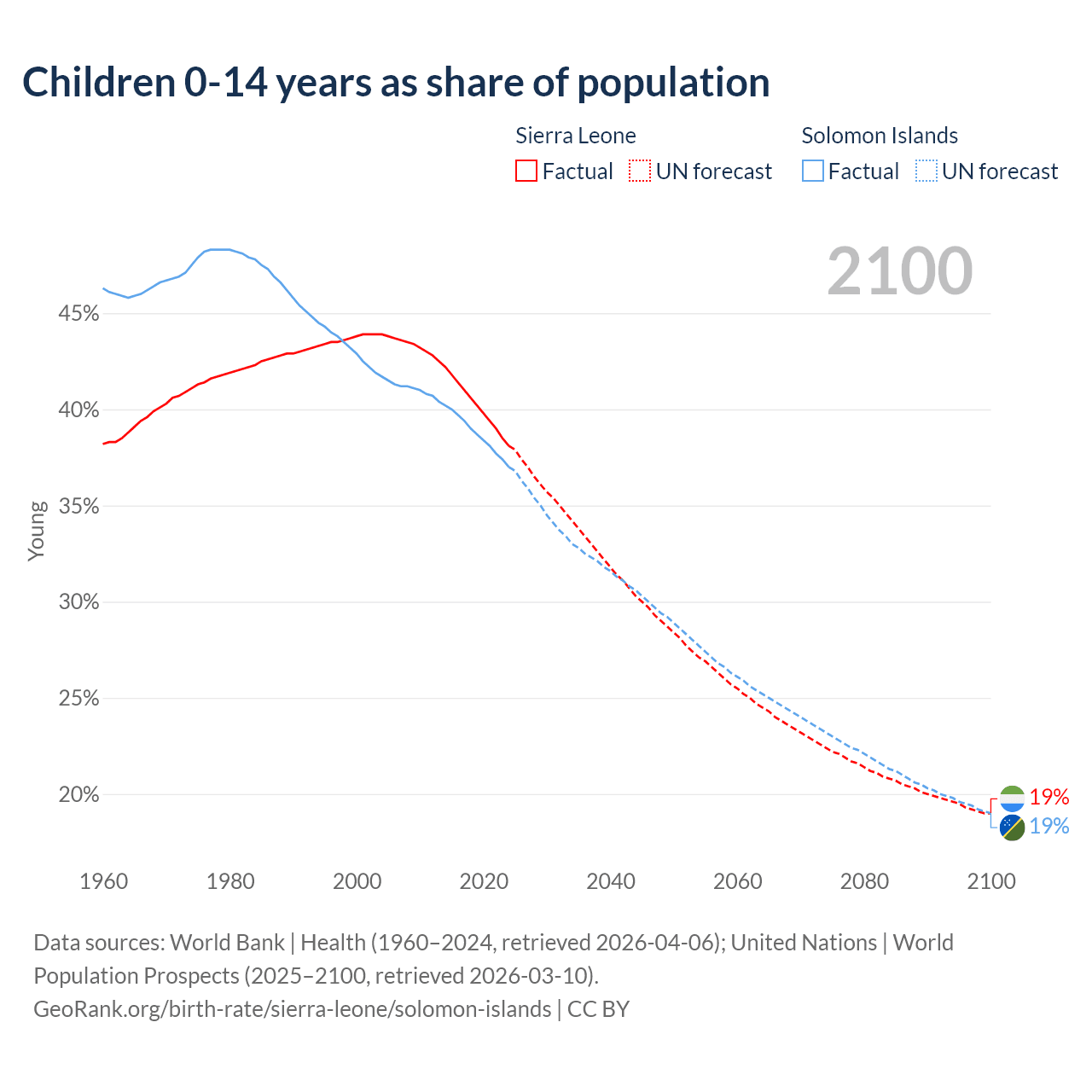 According to the latest available data on birth rates, the fertility rate in Sierra Leone was 3.79 children per woman in 2023, compared to 3.56 in the Solomon Islands in 2023. The replacement level is considered to be 2.1 children per woman.